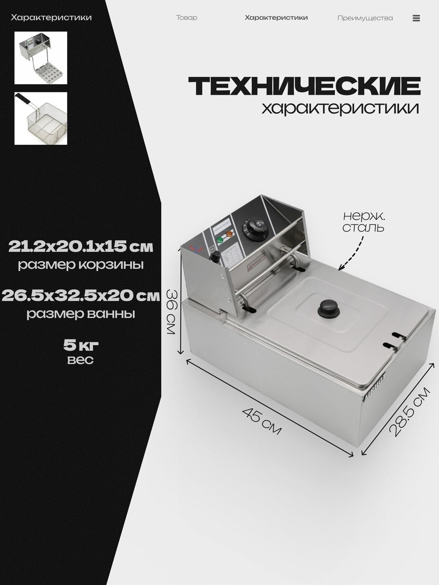 Модель оснащена холодной зоной и 2 термостатами: рабочим и аварийным. Корпус и ванна выполнены из нержавеющей стали.