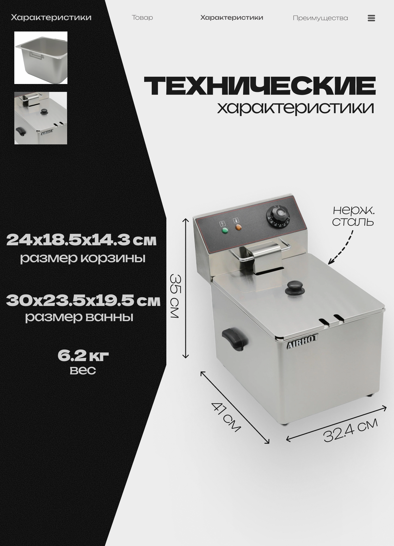 - Размер фритюрницы 324х410х350мм, вес 6,2кг