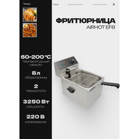 Электрическая фритюрница AIRHOT EF8 мощностью 2800 Вт предназначена для приготовления разнообразных кулинарных изделий во фритюре. Обеспечивает получение золотистой корочки у чебуреков, пирожков, картофеля фри, сыра, рыбных палочек, роллов и т. д. Отлично подойдет для любого формата предприятия общественного питания и домашнего использования.