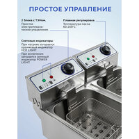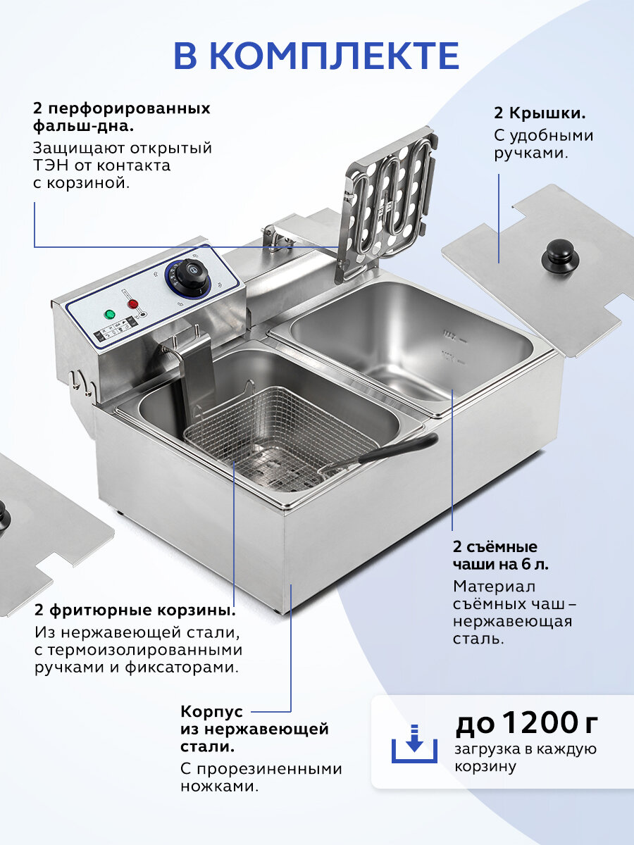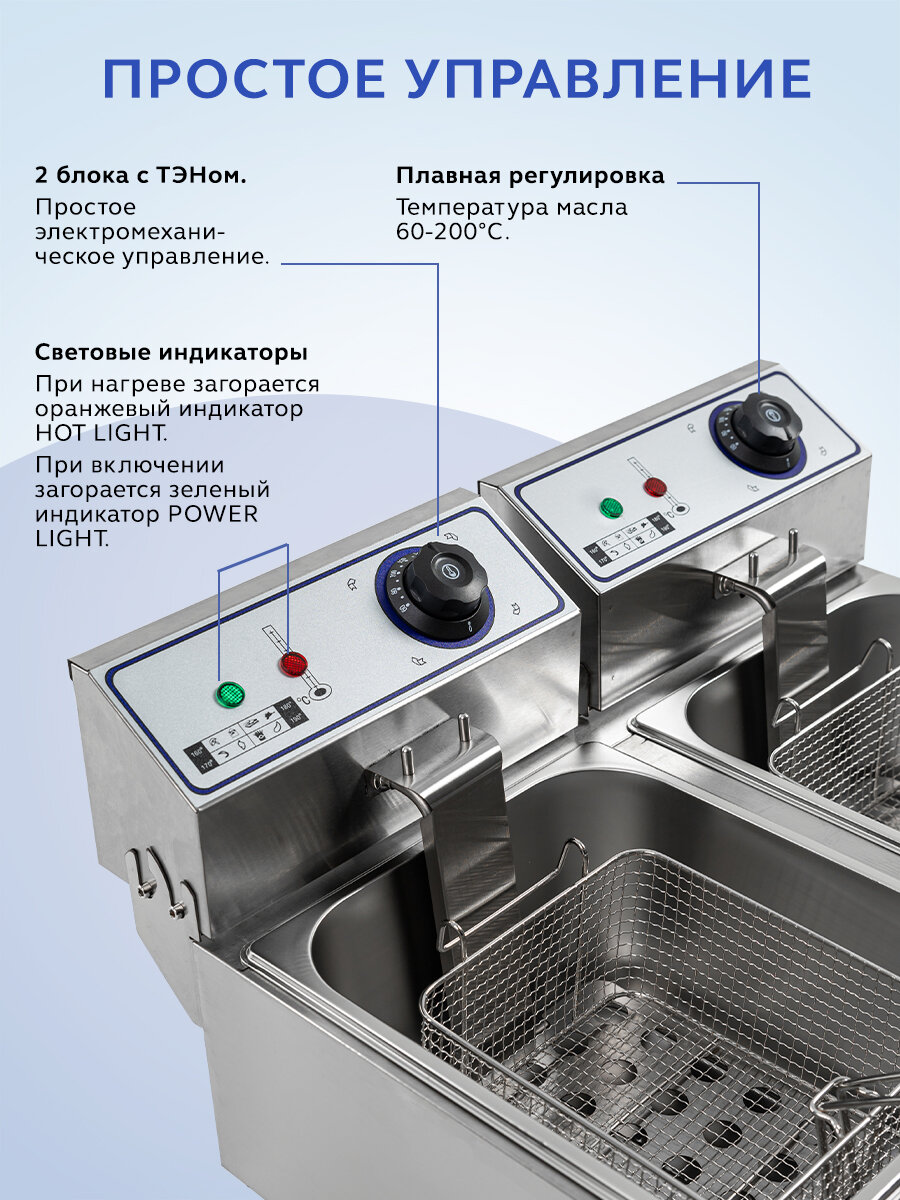Любите хрустящий золотистый картофель фри? Тогда электрическая фритюрница со съемными чашами Gastrorag HEF-82A – настоящая находка для вас! С ее помощью вы сможете приготовить для всей семьи и большой компании друзей не только вкуснейшую картошку, но и аппетитные наггетсы, куриные крылышки, луковые колечки, кольца кальмара в восхитительной хрустящей панировке. Кухонный электро прибор легко справится с обжариванием в масле пирожков, пончиков, беляшей и чебуреков. Вопреки общепринятому мнению, приготовление блюд во фритюре не вредно. Продукты, погруженные в кипящее масло, моментально покрываются корочкой, которая защищает их от поглощения лишнего жира и сохраняет нежными и сочными внутри. Главное – не пережаривать пищу, а также вовремя фильтровать и почаще менять масло. Большая фритюрница чебуречница может использоваться и как бытовая техника для дома и домашней кухни, и как профессиональная техника для кафе, ресторанов быстрого питания фаст фуд, уличной торговли, летних открытых площадок. Мощная настольная электрофритюрница оснащена двумя съемными чашами объемом 6 л и двумя большими сетками из нержавеющей стали, в каждую из которых можно загрузить до 1.2 кг продукта. Перфорированное фальш-дно защищает открытый ТЭН от контакта с сеткой. Фритюрный шкаф Gastrorag имеет простое электромеханическое управление, температура масла в каждой чаше плавно регулируется в диапазоне 60-200оС. Электроприбор безопасен в работе – в случае перегрева аварийный термостат отключит питание. Корпус фритюрницы изготовлен из нержавеющей стали и оснащен нескользящими резиновыми ножками.