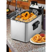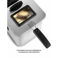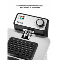 Во фритюрнице Kitfort КТ-4053 продукты жарятся в глубоком слое горячего масла. Продукты во фритюре готовятся быстрее, чем на сковороде из-за короткого воздействия высокой температуры со всех сторон. Несмотря на то, что продукты готовятся в масле, в жаренных во фритюре продуктах масла обычно содержится меньше, чем в жаренных на сковороде. Хорошо зажаренные во фритюре продукты покрыты хрустящей корочкой, под которой почти нет масла. Во фритюре можно готовить картофель фри и картофель по-деревенски, чипсы, овощи, рыбу, мясо и птицу, куриные окорочка и крылышки, креветки. Все это можно жарить в кляре и без кляра. Кроме этого, можно жарить котлеты, чебуреки, пельмени, фрикадельки, пирожки, беляши, пышки, пончики и многое другое, например, луковые кольца, кольца кальмаров, грибы и даже соленья. У фритюрницы есть «холодная зона» — это зазор между чашей и нагревателем. Нагреватель во фритюрнице съемный погружной и при установке в чашу не достает до дна. Поэтому осадки от продуктов на дне чаши находятся в самом холодном месте, они не будут гореть и давать неприятный запах и привкус. Рекомендуется периодически, перед очередной закладкой продуктов, фильтровать масло или удалять осадки со дна чаши фритюрницы. С помощью регулятора вы можете плавно менять температуру приготовления. Фритюрница КТ-4053 укомплектована корзиной для жарки. Боковые ручки, ручки крышки и корзины выполнены из термостойкой пластмассы. Корпус, крышка и корзина выполнены из нержавеющей стали. Крышка фритюрницы является съемной, поэтому ее легко мыть. В крышке фритюрницы имеется смотровое окно, через которое вы сможете следить за степенью готовности блюда, не поднимая крышку. Фильтры на вентиляционной решетке поможет сдержать распространения запаха и маслянистых испарений во время жарки. Блок управления с нагревателем просто снимается с фритюрницы, чтобы появилась возможность достать чашу и вымыть ее. Для экономии места при хранении предусмотрена съемная ручка корзины.