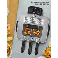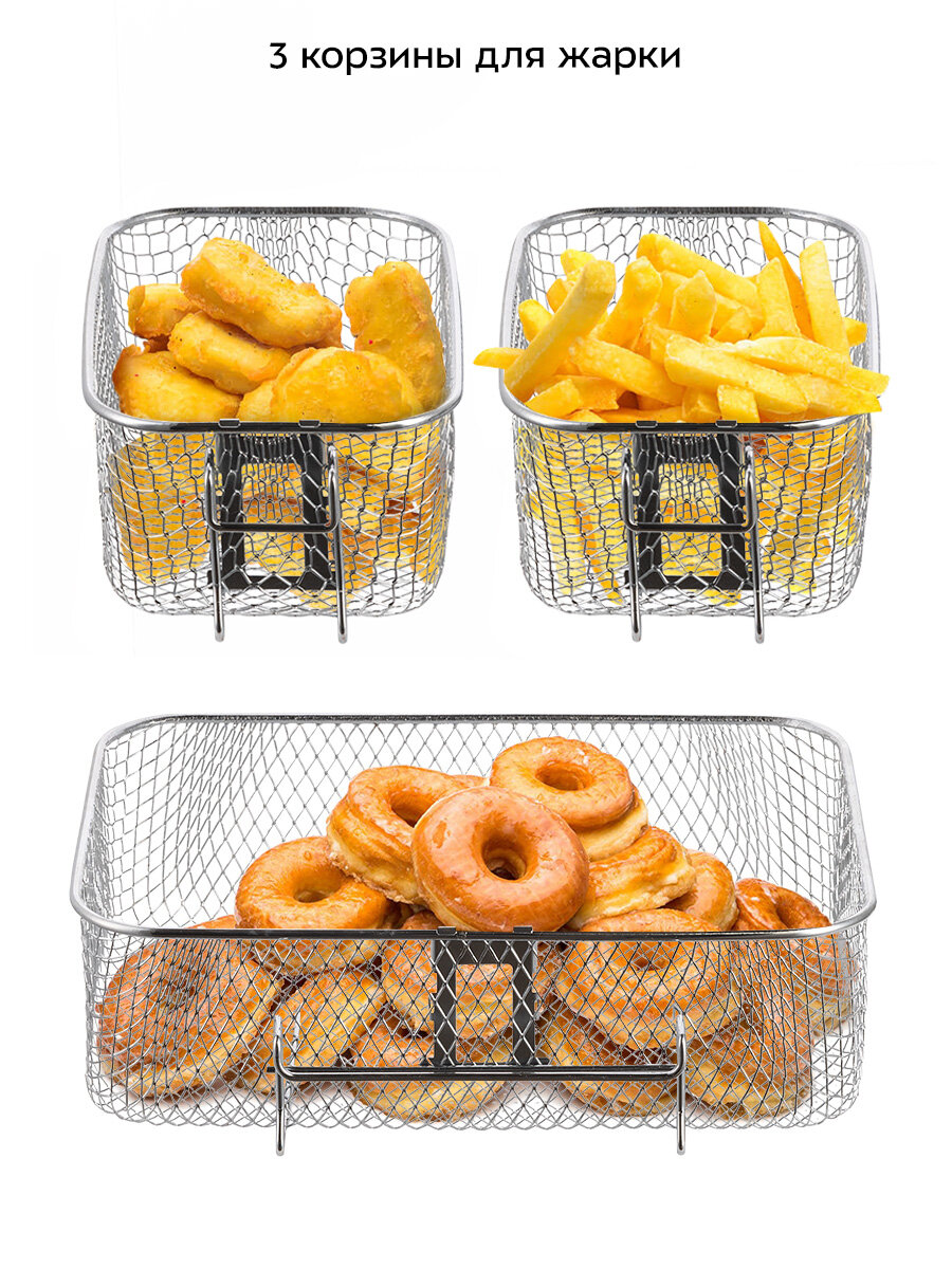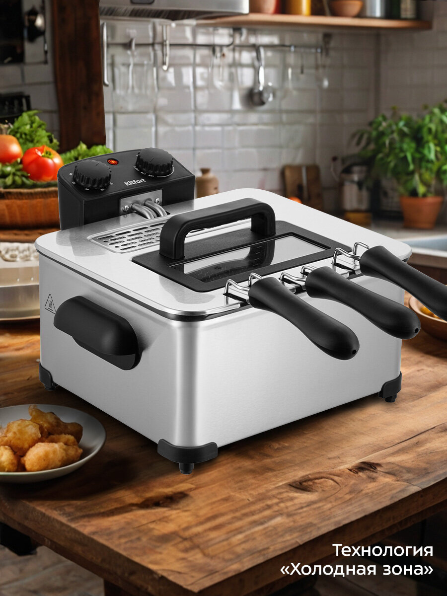 Хрустящее снаружи, нежное внутри! Фритюрница КТ-6481 предназначена для приготовления продуктов в горячем масле. Прибор позволит вам в домашних условиях приготовить любимые блюда: картофель фри, пончики, чебуреки или куриные крылышки. 3 корзины для жарки Фритюрница укомплектована тремя корзинами для жарки - одной большой и двумя маленькими. Малые корзины вы можете устанавливать во фритюрницу одновременно. Это удобно, если вы хотите приготовить два различных блюда. Всё продумано! Технология «Холодная зона» предотвращает подгорание мелких кусочков продуктов. Масло будет дольше сохраняться чистым, и его можно использовать до 10-15 раз повторно. Крышка оборудована смотровым окошком, через которое можно наблюдать за процессом. Полностью разборная конструкция! После приготовления фритюрницу легко разобрать и очистить от загрязнений.