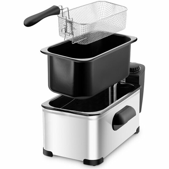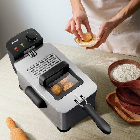 С хрустящей корочкой вкуснее! Фритюрница КТ-6483 предназначена для приготовления продуктов в слое горячего масла. Прибор позволит приготовить любимые блюда дома, такие как картофель фри, пончики, куриные крылышки, а также жарить овощи , мясо и морепродукты в кляре и без. Наблюдайте за процессом приготовления В крышке фритюрницы имеется окно, через которое вы сможете следить за готовностью блюда. Крышка прибора съёмная, что упрощает уход за фритюрницей. В крышке находится фильтр, который сдерживает распространение запаха и маслянистых испарений во время жарки. Чаша и корзина в комплекте В комплекте предусмотрены корзина для жарки и чаша. У корзины есть ручка, для удобства хранения она съёмная. В корпус устройства устанавливается чаша, в которую погружается нагревательный элемент. Простое управление С помощью регулятора температуры вы можете устанавливать желаемые температуру приготовления. Индикатор нагрева показывает, когда масло нагрелось до выбранной температуры.
