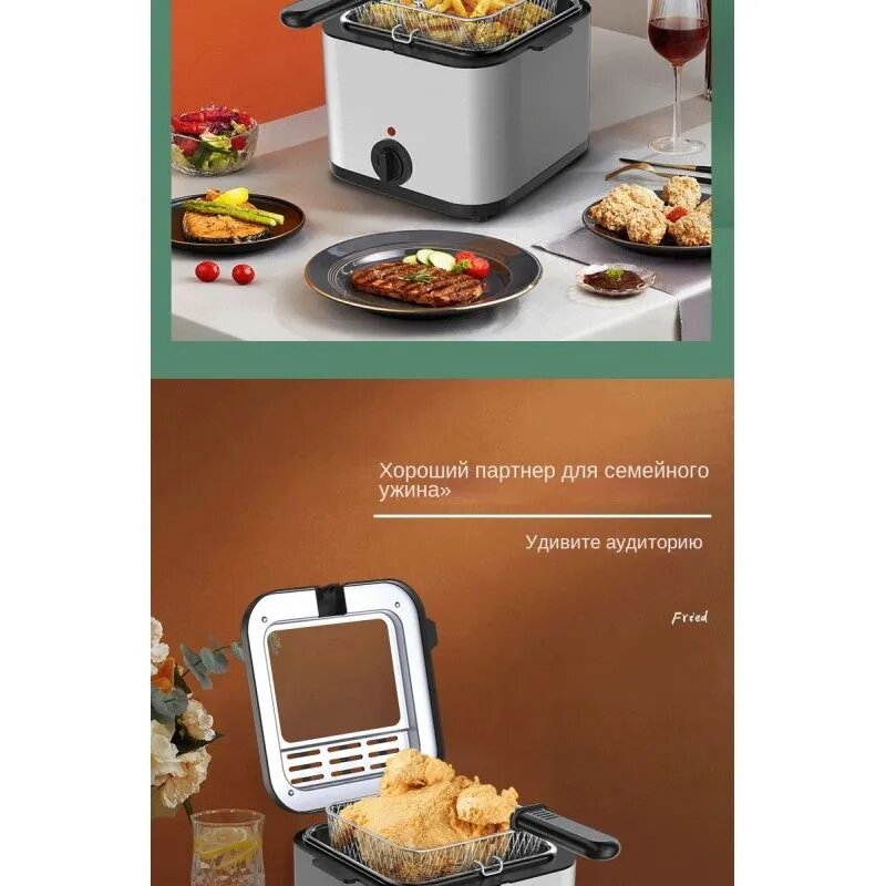 Профессиональная электрическая фритюрница мощностью 1200 Вт для быстрого приготовления во фритюре овощей, мяса, курицы, рыбы и морепродуктов, сыра, грибов и других вкусных блюд. Из-за короткого воздействия высокой температуры на продукт со всех сторон, блюда, приготовленные во фритюрнице полезнее, чем приготовленные на сковороде и содержат меньше масла. Фритюрница полностью разборная, что удобно для использования и ухода, все детали снимаются и легко моются. Съемная чаша объемом используемого масла до 2,5 литра имеет антипригарное покрытие и уровни MIN 1,2 л и MAX 2,5 л. Металлическая корзина с не нагревающейся ручкой. Съемная крышка с прозрачным окном для наблюдения процесса приготовления и встроенным фильтром для очищения выходящего дыма и пара. Защитный корпус фритюрницы из нержавеющей стали - это надежно и безопасно для приготовления продуктов при высоких температурах.