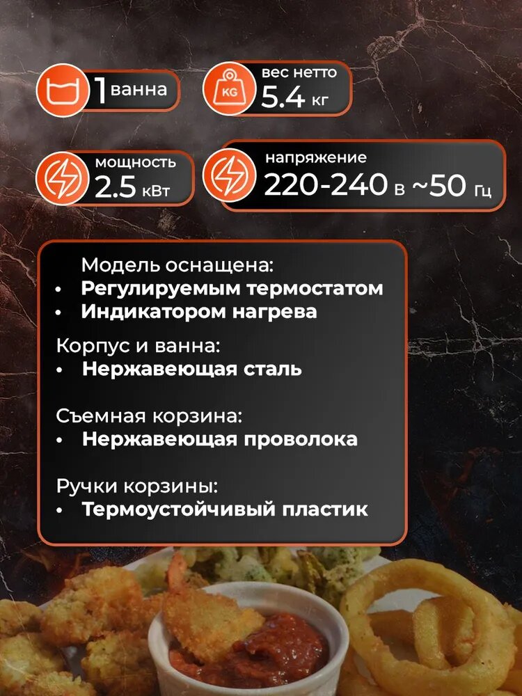 Габаритные размеры: 265х430х330 мм. Количество ванн: 1 шт. Объем: 6 литров. Мощность: 2,5 кВт. Напряжение: 220-240 В ~50 Гц. Вес 5,4 кг. Темп. режим от 60 до 200 °С. Модель оснащена регулируемым термостатом, индикатором нагрева и защитой от перегрева. Корпус и ванна изготовлены из нерж. стали, съемная корзина - из нерж. проволоки, ручки корзины - из термоустойчивого пластика. В комплект поставки входит корзина с крышкой. Изготовлен из высококачественных комплектующих и материалов. Китай.