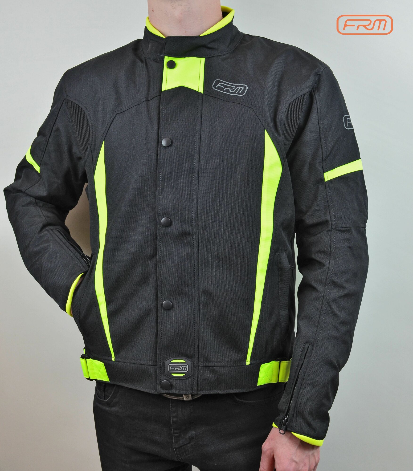 Текстильная мотокуртка от бренда FRM изготовлена из водонепроницаемого, устойчивого к истиранию материала, обеспечивающего большую безопасность и долговечность. Куртка оснащена утеплённой съёмной подкладкой, что делает данную экипировку универсальной для любой погоды. Мото куртка имеет сменные защитные вставки плеч и локтей, изготовленные из вспененного материала EVA. Мотокуртка застёгивается при помощи молнии, которая закрывается клапаном на кнопках, что дополнительно защищает мотоциклиста от непогоды.
