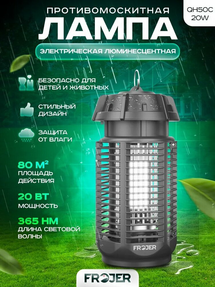 Электрическая ловушка для насекомых Frojer QH50C-20W– ваш надежный защитник от летающих вредителей! эффективное и безопасное устройство номинальной мощностью 20 Вт, которое обеспечивает защиту от комаров, мошек, мух, ос, моли и других летающих насекомых на площади до 80м2 станет вашим верным помощником как в квартире, так и на даче! Преимущества отпугивателя комаров и мух: Ловушка-уничтожитель работает на максимуме в вечернее и ночное время, когда насекомые наиболее активны. УФ-свет привлекает их, а затем они погибают при контакте с сеткой. Вертикальное расположение прутков предотвращает накопление насекомых, которые просто падают в съемный лоток. Пластиковый корпус антимоскитной лампы защищает электроконтакты от дождя, что позволяет использовать ловушку на улице даже в ненастную погоду (но не погружайте в воду!). Антимоскитная ловушка легко очищается – просто вытряхните поднос и протрите решетку кисточкой. Фонарь-ловушка против насекомых идеально подходит для:- Загородных домов- Кемпинга- Беседок и верандПросто включите ловушку комаров в розетку, и наслаждайтесь комфортом на природе без назойливых летающих насекомых. Frojer QH20-15W – это не только отпугиватель, но и эффективный уничтожитель москитов, который обеспечит безопасный отдых для вас и ваших близких. Не упустите возможность сделать ваше времяпрепровождение на свежем воздухе более комфортным и приятным! Закажите домашнюю электромухобойку для насекомых Frojer QH50C-20W прямо сейчас и забудьте о назойливых вредителях!