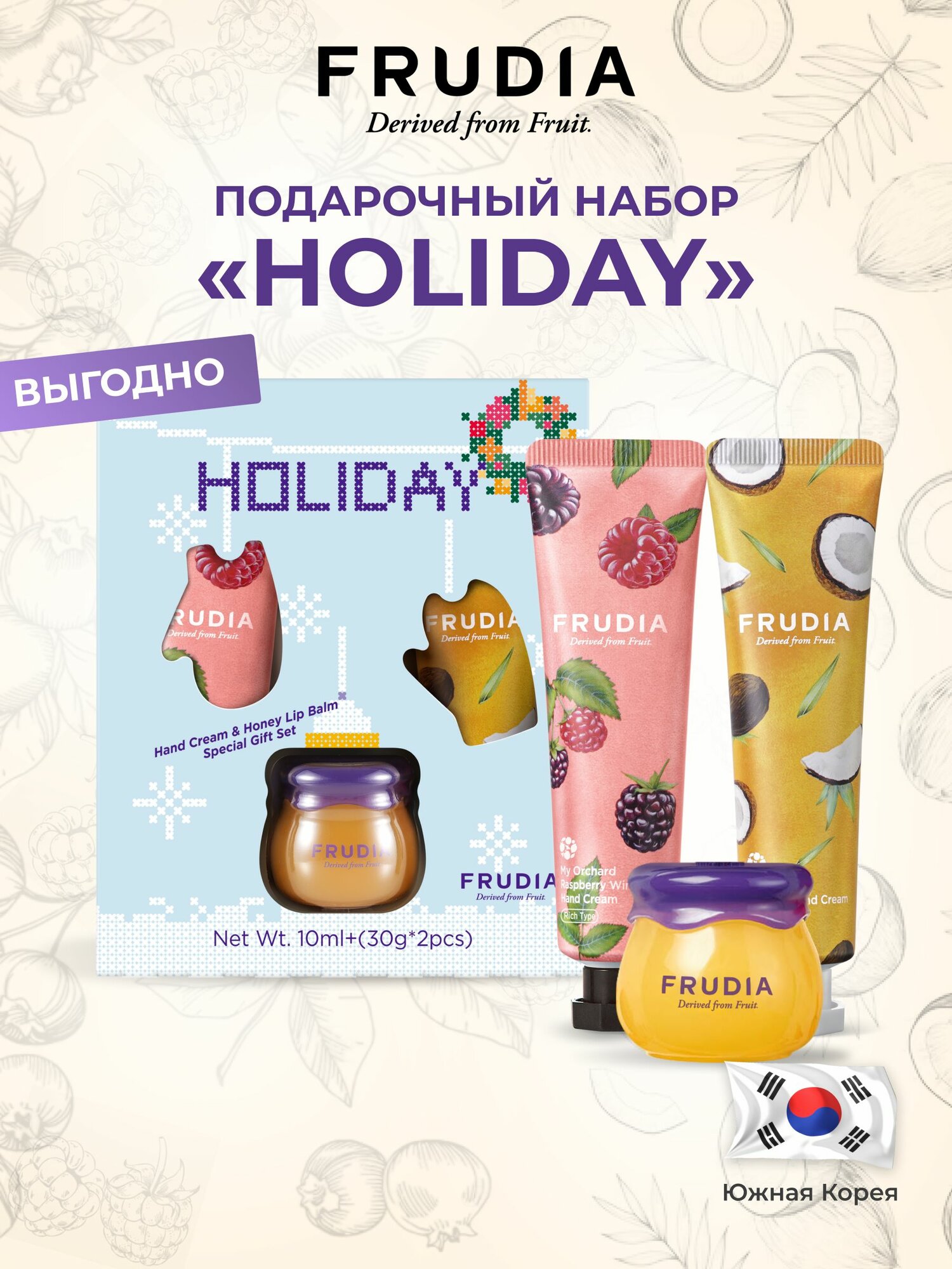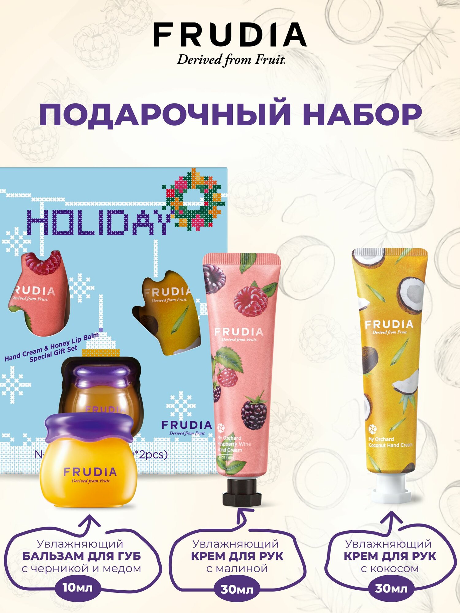 | Состав | Крем с малиной: сквалан, масло ши, экстракты плодов черники и малины, масло косточек винограда и абрикоса, пантенол, экстракт меда, центелла азиатская экстракт, масло семян томата, граната, манго и грейпфрута, токоферол. Крем с кокосом: вода из кокоса, сквалан, масло ши, экстракт плодов граната, масло косточек винограда и абрикоса, пантенол, масло косточек томата, масло семян граната, манго и грейпфрута, экстракт меда, экстракт центеллы азиатской, токоферол. Бальзам для губ: пчелиный воск, масло семян клещевины, масло косточек абрикоса и винограда, экстракт листьев черной смородины, экстракт плодов черники, масло семян грейпфрута, экстракт меда, масло семян манго, граната и томата, экстракт корня анемаррены асфоделовидной, токоферол. |