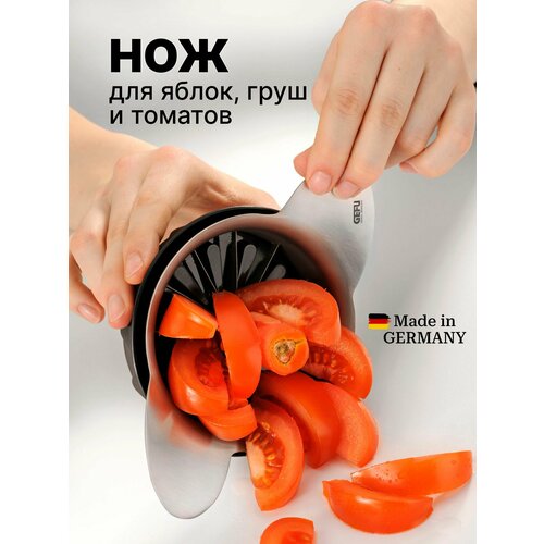 Овощерезка для помидоров позволяет разрезать помидоры на 12 сочных долек. Просто поместите помидор в центр основания-подставки, разместите нож таким образом, чтобы его центральное кольцо находилось над сердцевиной и нажмите - овощерезка не только разрежет помидор, но и отделить сердцевину. Сок стечет в основание-подставку, а стол останется чистым.