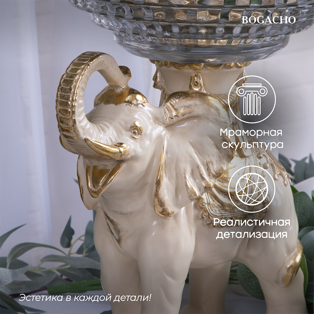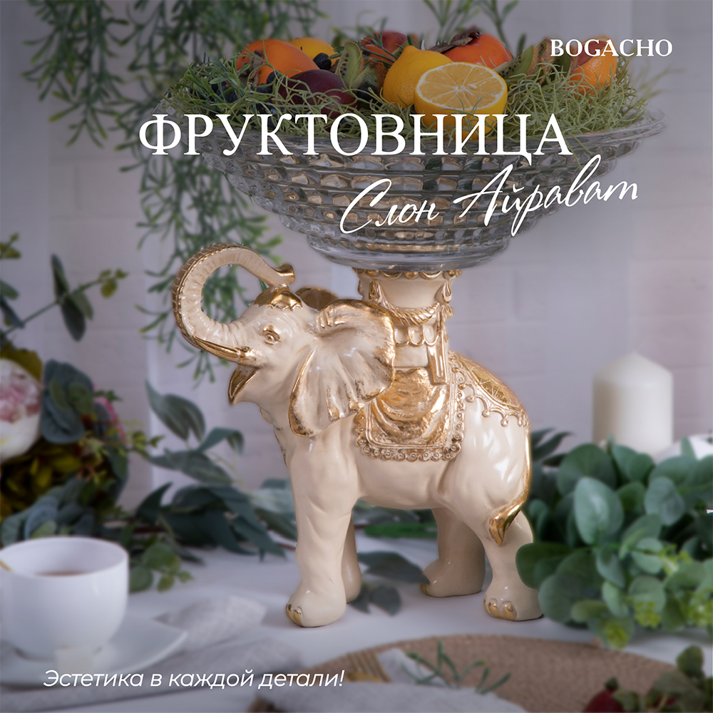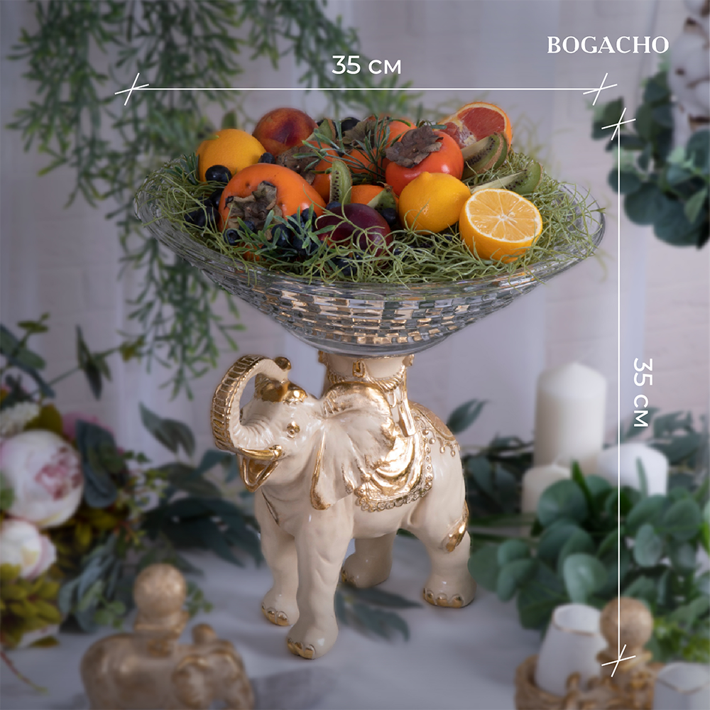 Фруктовница-конфетница Слон Айрават- поистине царское украшение вашего стола. Изящная ваза для фруктов отличной подойдет для конфет, печенья или пирожных и других десертов. Ее сложно отнести к просто разряду кухонных принадлежностей. Этот уникальный инвентарь для столовой скорее изысканный декор для кухни или праздничное сервировочное блюдо. Блюдо для подачи со стеклянной чашей разнообразно в своем функционале. Это может быть тортовница или тарелка новогодняя, креманка или икорница. В нашем ассортименте для сервировки стола Вы найдете фруктовницы на ножке и блюдо на ножке. Подставка для подачи фруктов запомнится Вашим гостям. Блюдо этажерку для фруктов можно использовать не только как посуду для сервировки стола на кухне. Это стильный элемент декора в гостиную и для дачи в беседку. Можну купить ее для офиса или в приемную. Фруктовница -это оригинальный подарок сувенир маме и бабушке на день матери или на новый год и рождество. Подруге или любимой девушке можно ее преподнести на 14 февраля или годовщину. Отличное решение в качестве подарка любой женщине на 8 марта! Сестре и коллеге на новоселье. Мы уверены, что этот подарок станет самым желанным для всех женщин! Основание фруктовницы выполнено из натурального материала – литьевого мрамора. Данный аксессуар для дома подойдет для интерьеров в разных стилях. Идеально впишется в классический стиль, модерн или романтизм. Разбавит стиль лофт или сканди, а также минимализм. Посуда и текстиль в дополнении могут быть любыми, ведь главное украшение стола всегда у вас под рукой! Для защиты стола от царапин, мы установили накладки из мягкой ткани, препятствующая истиранию поверхности. Фруктовница на ножке завернута в воздушно - пузырчатую пленку, ложемент и надежно упакована в коробку из гофрированного картона, поэтому данный аксессуар для интерьера приедет к вам не поврежденным. Любите, чтобы интерьер был в едином стиле? Присмотритесь к продукции BOGACHO, которая будет гармонично сочетаться друг с другом.