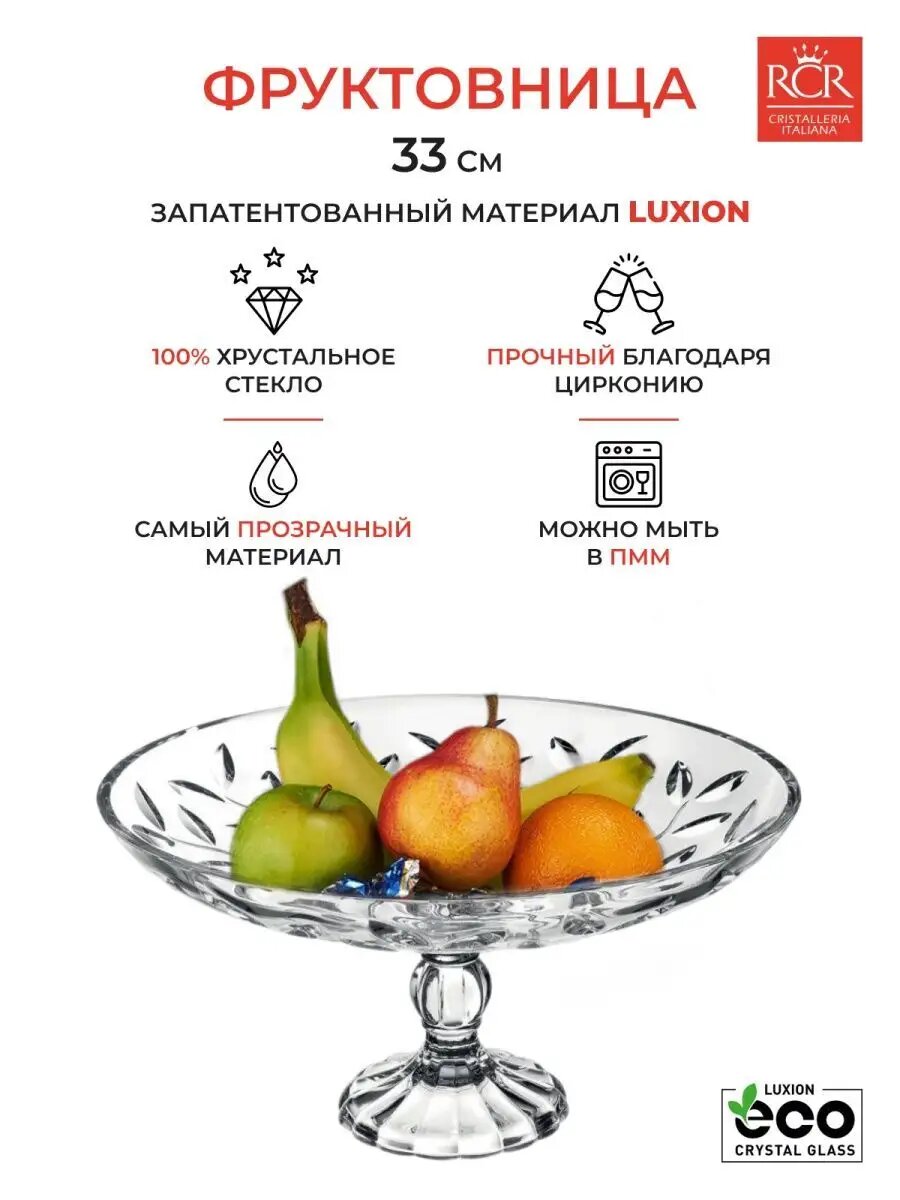 Фруктовница RCR Laurus 33см Она настолько прозрачная и кристально чистая, как будто вырезана из куска нетронутого арктического льда. Фруктовница на устойчивой ножке поможет вам оригинально подать свежие фрукты к десертному столу, создав эффект изобилия и не занимая при этом слишком много места. Изделие можно использовать не только по праздникам, но и ежедневно – этому способствует высокое качество и неприхотливость материала в уходе. Эко-хрусталь по своим физико-механическим характеристикам порой не уступает хрусталю, а цена вас приятно удивит.