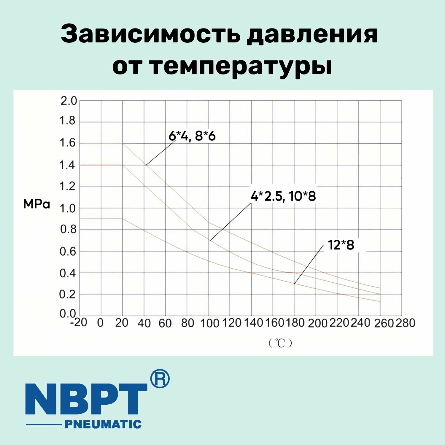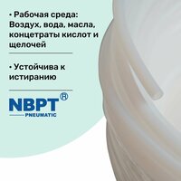 Материал трубки: Политетраоксиэтилен Рабочая среда: Воздух, вода, масло, концетраты кислот и щелочей Температурный режим: -40 °С - +260 °С Рабочее давление зависит от температуры работы, смотрите график на последнем фото в карточке товара.