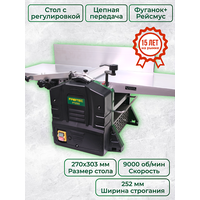 Фуговально-рейсмусовый станок FABTEC PT260 предназначен для строгания и рейсмусования заготовок из дерева; Строгальный вал имеет 2 ножа, которые вращаются со скоростью 9000 об/мин, что гарантирует высокое качество обработки. Размер ножей 258 х 22 х 1.8 мм; Регулировка подачи стола позволяет выполнять точную обработку заготовок, ширина зазора 252 мм; Максимальная ширина рубанка 252 мм, высота зазора 5-120 мм; Станок имеет компактную, мобильную конструкцию. Основные характеристики: Ширина строгания: 250 мм Размер стола: 270x303 мм Скорость подачи при рейсмусовании: 9000 м/мин Максимальная глубина строгания: 2 мм Кол-во ножей: 2 шт Скорость движения детали (рейсмус): 4 м/мин Передача: Цепная Диаметр аспирационного отверстия: 100 мм Min толщина заготовки (рейсмус): 5 мм Max толщина заготовки (рейсмус): 120 мм Тип станины: Сборная