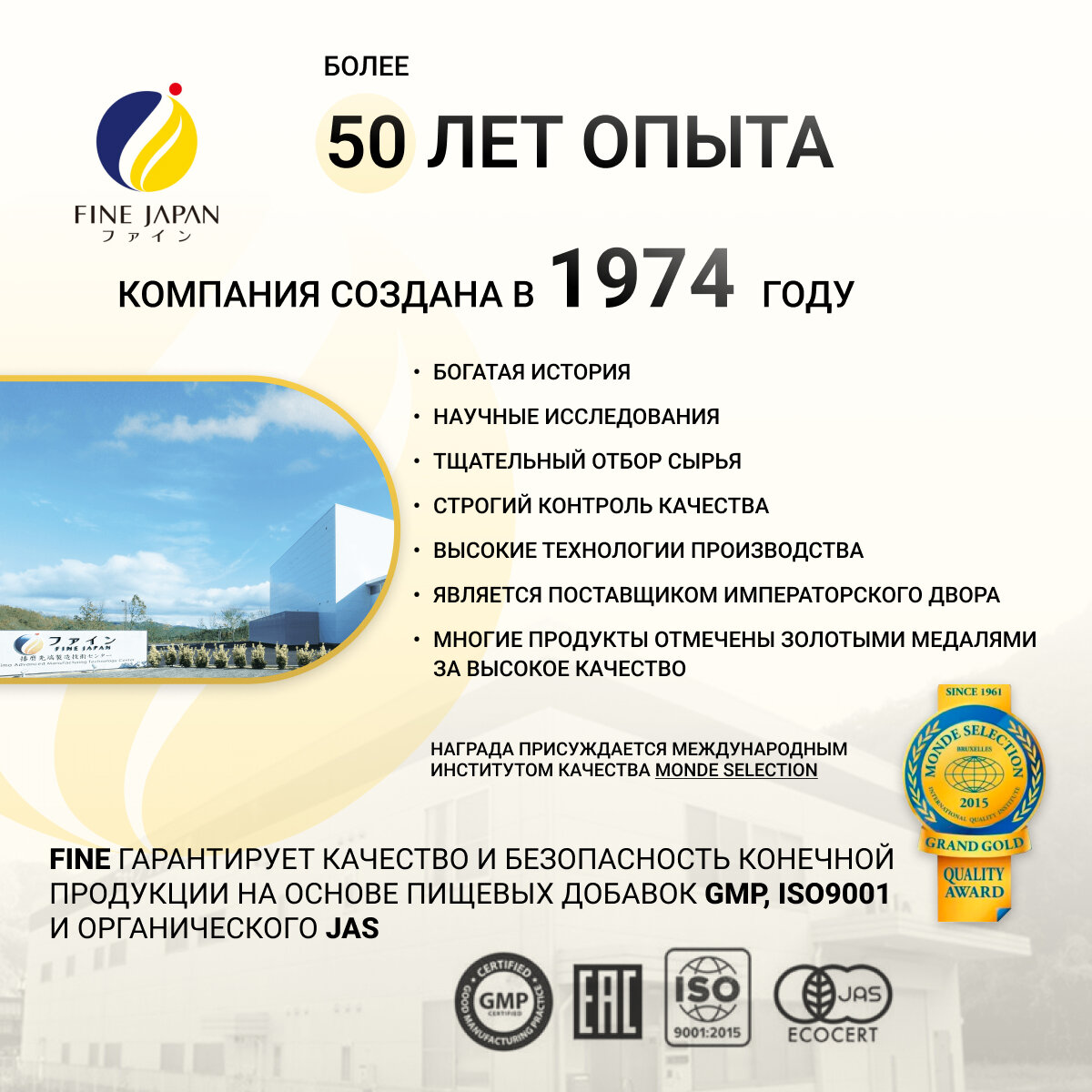 Сырье для производства выращено в естественных условиях с тщательным контролем чистоты воды и почвы. Компания Fine Japan, производитель данного продукта, является компанией класса «Люкс», которая использует передовое оборудование и собственную лабораторию на базе Университета г. Осака.