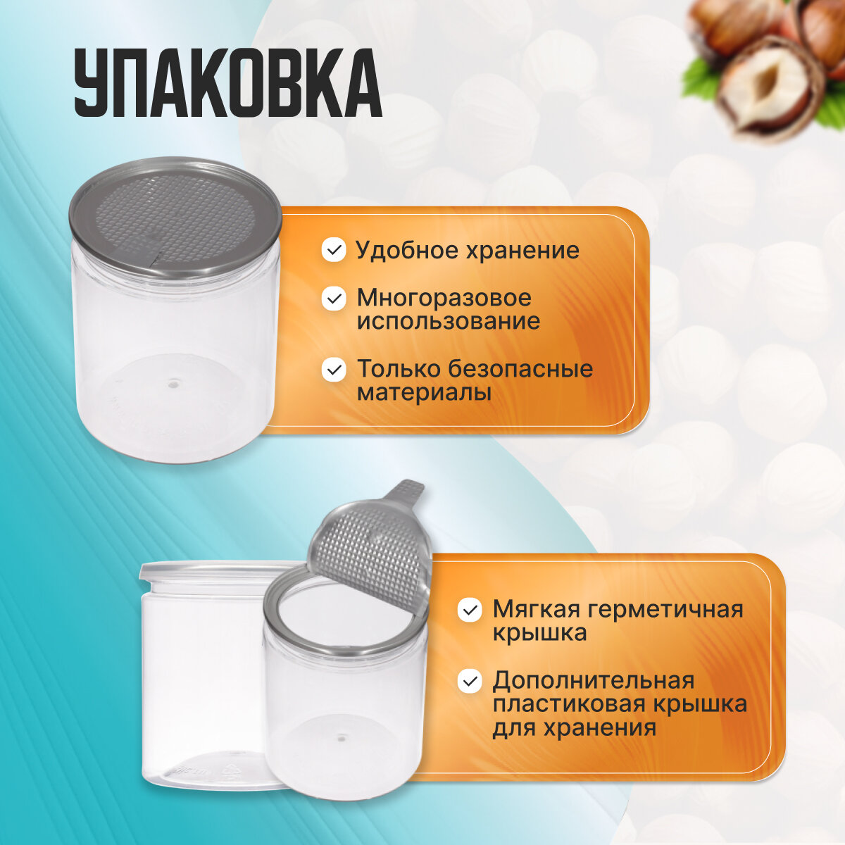 — Фундук (крупный, жареный, натуральный) в стильных банках по 500 грамм.