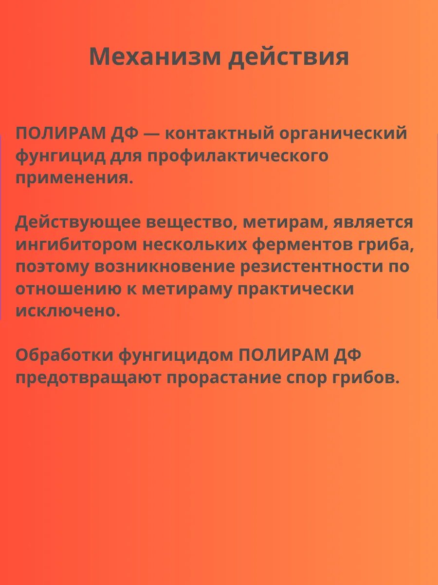 Контактный фунгицид широкого спектра действия для борьбы с болезнями плодовых, овощных культур и винограда. Вредный объект: Альтернариоз, Антракноз, Милдью, Парша, Ржавчина, Септориоз, Фитофтороз. Превосходно переносится культурой (не фитотоксичен), Быстрое начальное действие, Современная препаративная форма (легко дозируется, не образует пыли, быстро диспергируется в воде). Полирам - контактный органический фунгицид для профилактического применения. Позволяет бороться с широким спектром заболеваний на таких культурах как картофель, яблоня, виноград. Метирам - является ингибитором нескольких ферментов гриба. Вследствие этого возникновение резистентности по отношению к метираму практически исключено. Обработки фунгицидом Полирам предотвращают прорастание спор грибов.