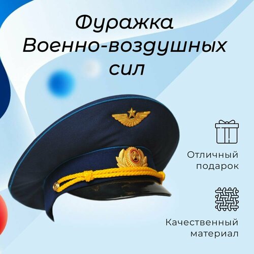 Фуражка ВВС синего цвета с кокардой. Материал изготовления: П/Ш. Продукция поставщика является высвобождаемым движимым военным имуществом, то есть имуществом, сокращаемым в соответствии с международными договорами, а также излишествующее, морально или физически устаревшее, не используемое или не нашедшее применение в Вооруженных Силах Российской Федерации. Данная продукция содержит в своем ассортименте товары, которые имеют отличительные характеристики внешнего вида в виде незначительных царапин, остаточных проявлений конверсионной смазки, обусловленные длительным сроком хранения, не влияющие на качество. Оригинальное изделие произведено в СССР или в России и в настоящий момент является коллекционным антикварным предметом, который можно использовать по прямому назначению.