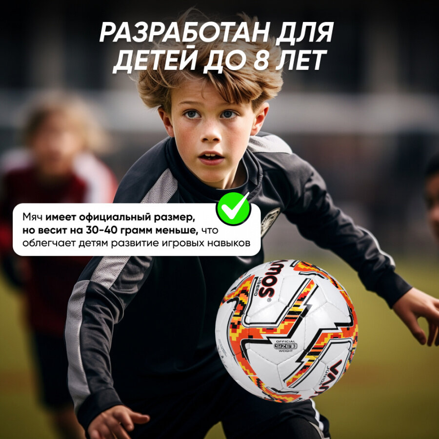Размер 3. В футбольных секциях дети начинают заниматься в раннем возрасте, поэтому настоятельно рекомендуем, чтобы ребёнок в возрасте 4-8 лет играл с мячом размера 3. Во избежание травм стопы, лучше начинать с облегчённых мячей 3-го размера.