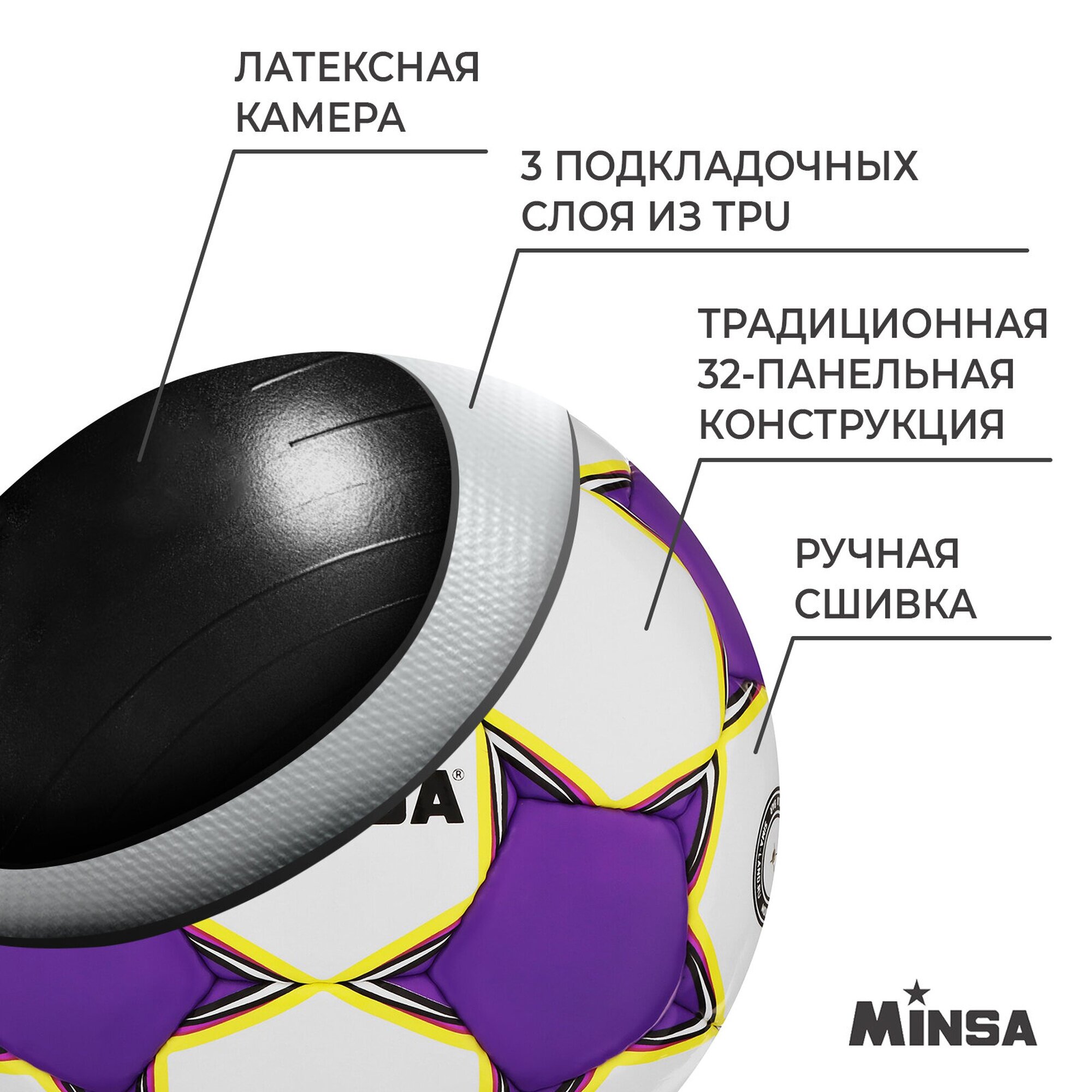Мяч футбольный MINSA Match, TPU, ручная сшивка, размер 5. Футбольный мяч - это самый главный предмет для детей и взрослых без которого игра невозможна. Количество панелей 32 Вес 430 г Материал термополиуретан Тип соединения панелей ручная сшивка Уровень спорта матчевый Материал камеры латекс