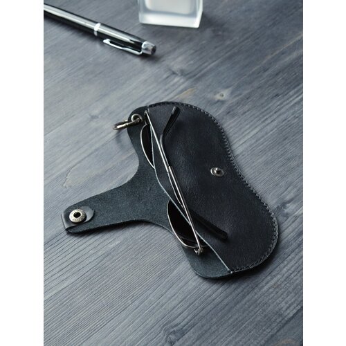 Натуральная мягкая воловья кожа черного цвета. Размеры в закрытом виде 7,5х18,2х1 см. Фурнитура цвета темный никель. В комплект входит один карабин за который очечник можно подвесить на сумку, брюки, рюкзак, цепочку на шею.