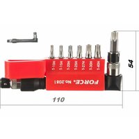 - Рабочие части и биты Г-образной отвертки с комплектом бит торкс с отверстием FORCE 1/4" 8 предметов 2081 изготовлены из прочной стали;