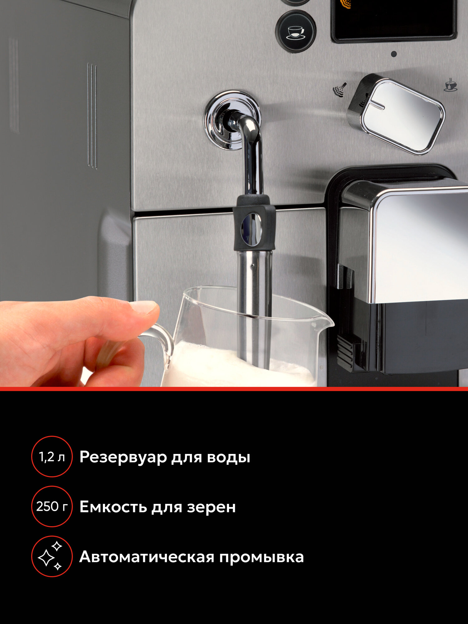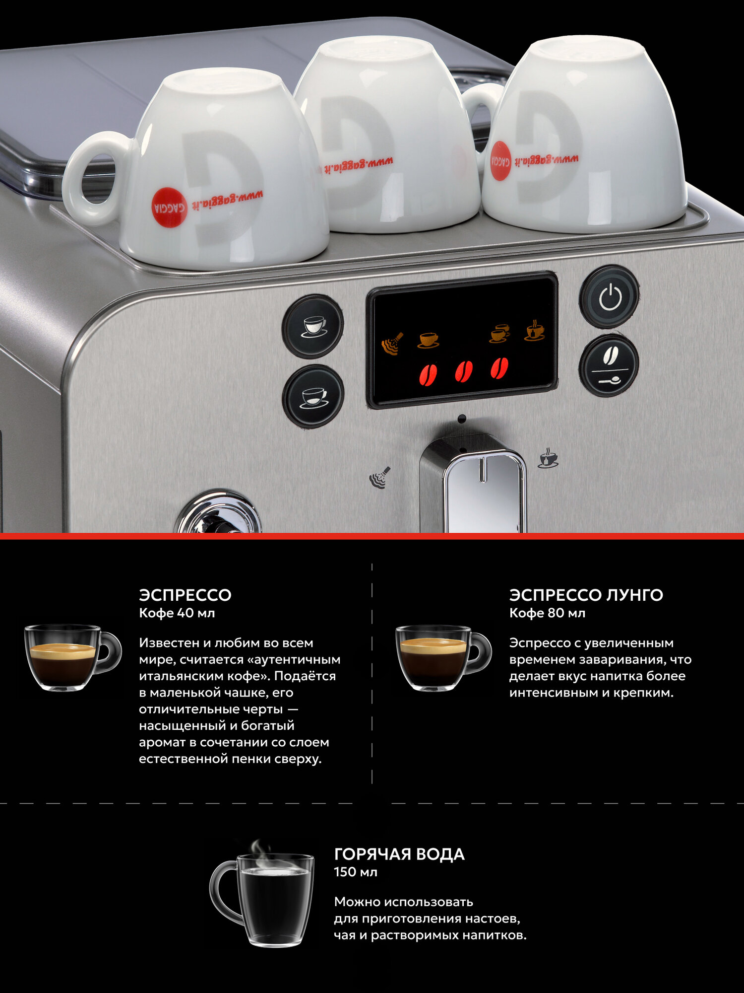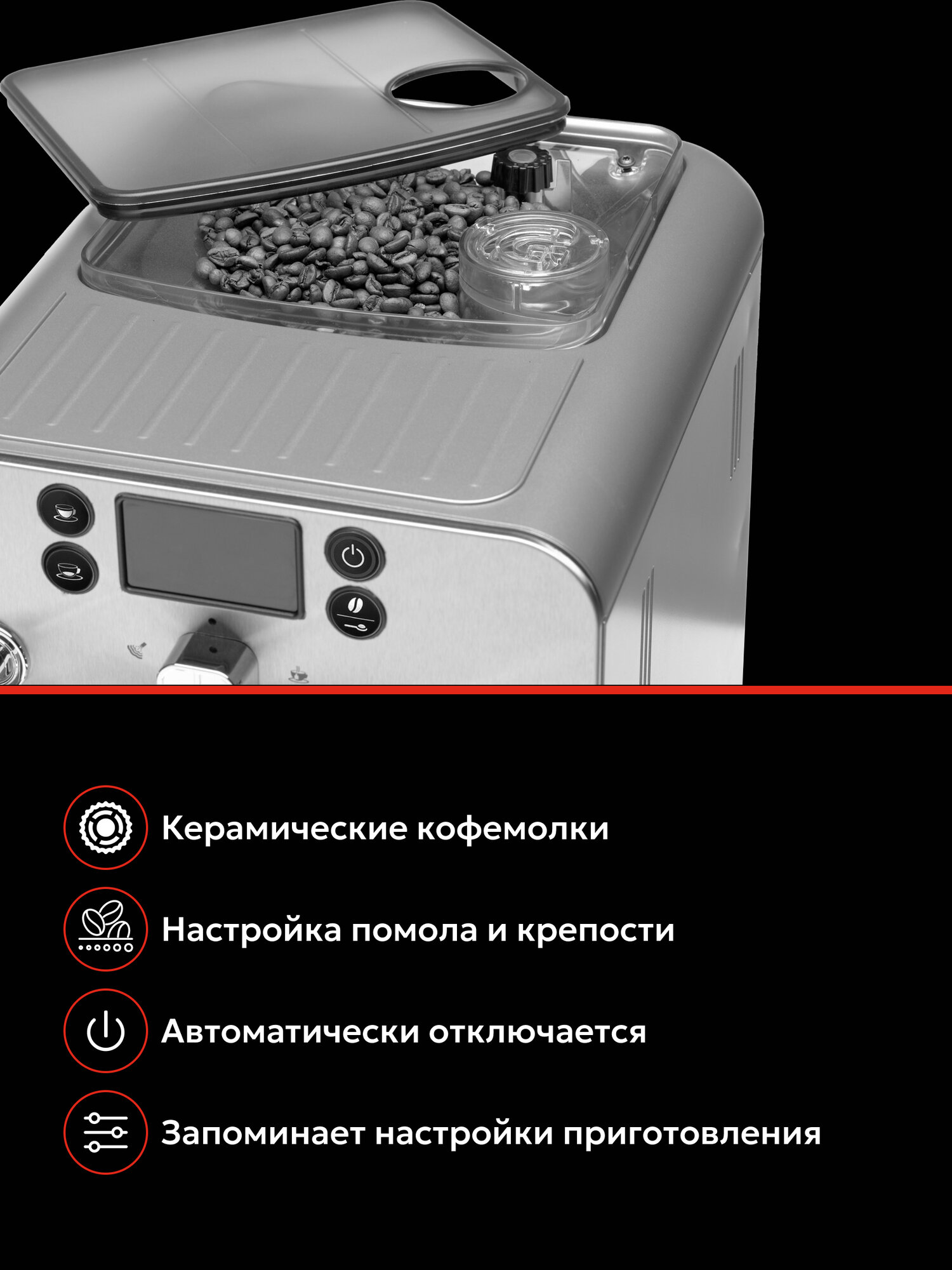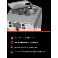 5 степеней помола; регулируемый по высоте узел подачи кофе; лицевая панель из нерж. стали