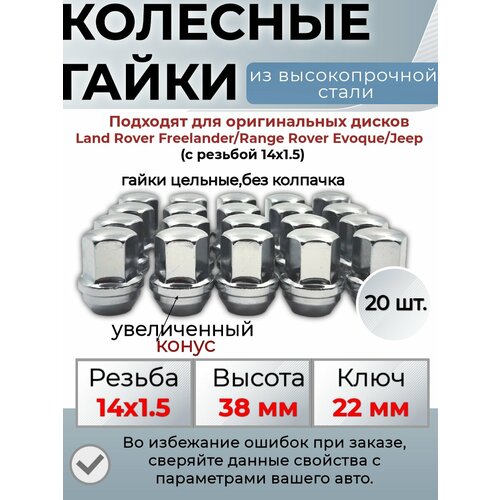 Колесные гайки для крепления дисков автомобиля. Гайка цельная (без колпачков). Материал: высокопрочная сталь. Класс прочности: 8.8 (соответствует требованиям к колесному крепежу мировых производителей автомобилей)- Резьба: 14х1.5- Высота, мм:38- Прижимная поверхность: увеличенный конус- Покрытие: хром- Ключ: 22 мм-Диаметр конуса: 26 мм. Комплект: 20 шт.-. Внимание! Во избежание ошибок при заказе, сверяйте данные свойства с параметрами вашего авто. Обращайте внимание на диаметр и шаг резьбы. Гайки колесные с увеличенным конусом, гайки М14х1,5, колесные гайки с большим конусом