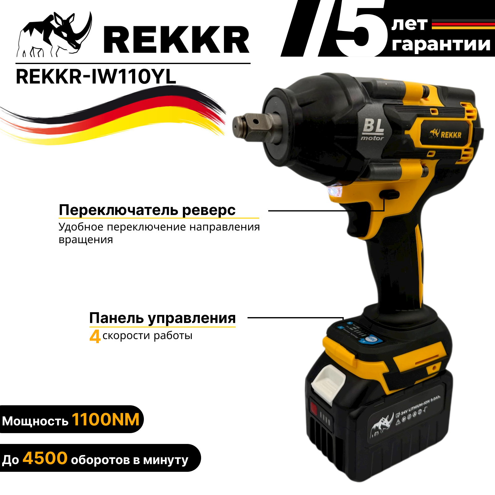 Гайковерт аккумуляторный, бесщеточный REKKR IW110YL, 2 аккумулятора 24В 9.0Ач, ударный, квадрат 1/2, кейс, зарядка: сравнение цен, характеристики, фото, актуальное наличие и цены.