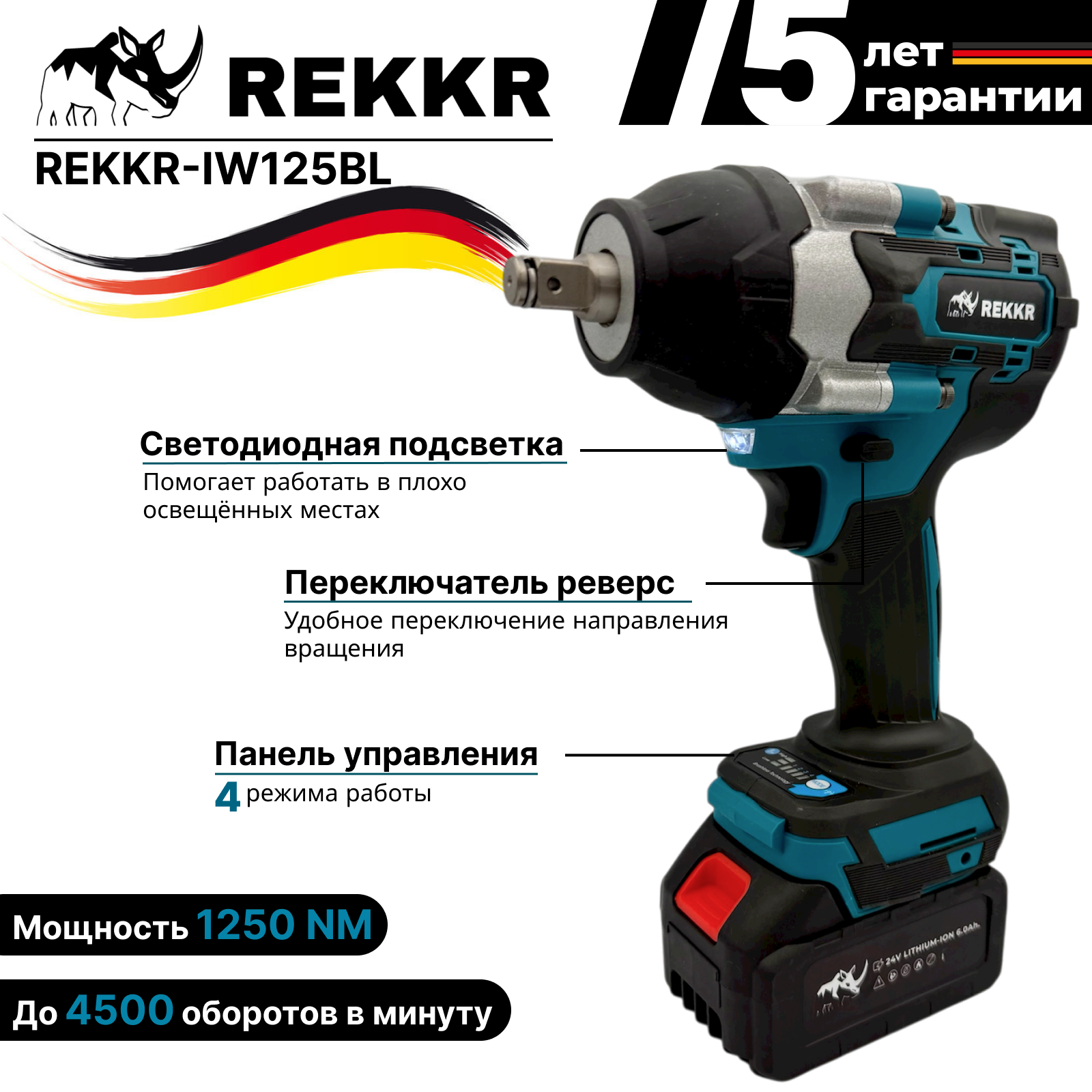 Гайковерт аккумуляторный, бесщеточный REKKR IW125BL, 2 аккумулятора 24В 6.0Ач, ударный, квадрат 1/2, кейс, зарядка: сравнение цен, характеристики, фото, актуальное наличие и цены.