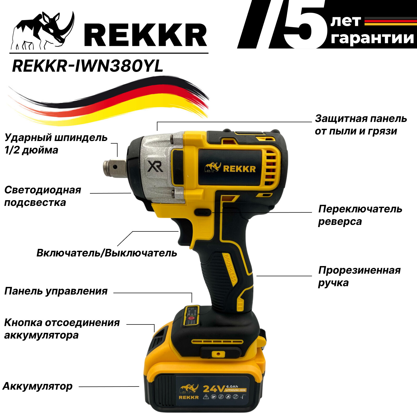 Гайковерт аккумуляторный, бесщеточный REKKR IWN380YL, 2 аккумулятора 24В 6.0Ач, ударный, квадрат 1/2, кейс, зарядка: сравнение цен, характеристики, фото, актуальное наличие и цены.