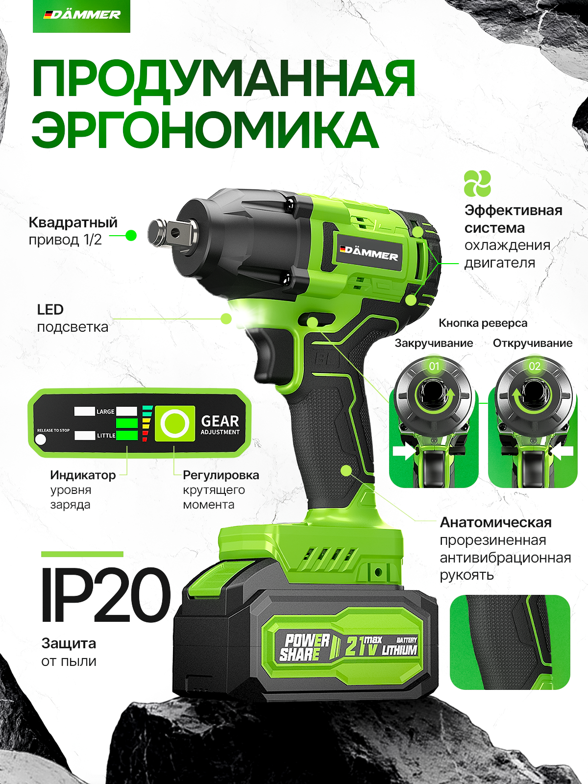 Гайковерт аккумуляторный бесщеточный ударный DAMMER 21 V - мощный и надежный инструмент для выполнения работ по монтажу и демонтажу резьбовых соединений.