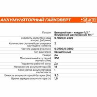 Особенности аккумуляторного гайковерта Sturm! CD20350BLC включают в себя: