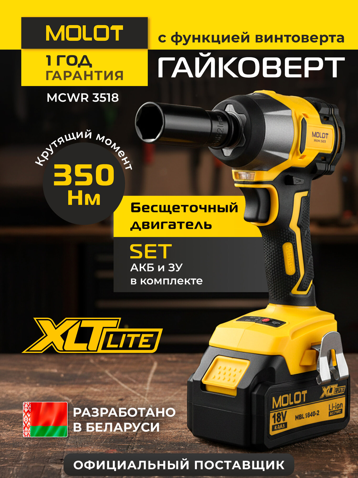 Купить Гайковерт аккумуляторный ударный MOLOT MCWR 3518 XLT Lite SET бесщеточный, с функцией винтоверта с доставкой по всей России. Гайковерт аккумуляторный ударный MOLOT MCWR 3518 XLT Lite SET бесщеточный, с функцией винтоверта: сравнение цен, характеристики, фото, актуальное наличие и цены.