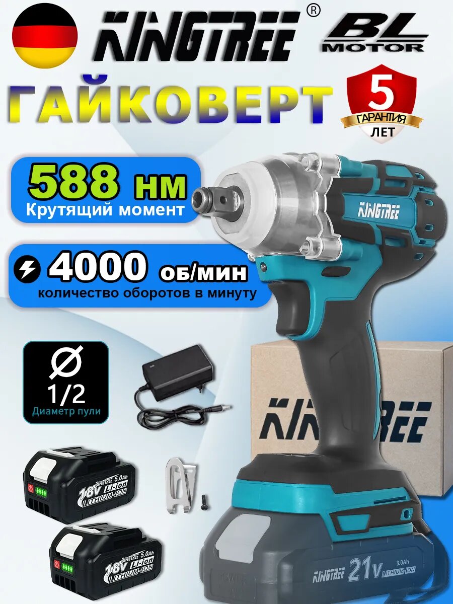 Гайковерт KingTree, ударный, бесщеточный, 588 Nm, 18 V, LED, защита от перегрузки,Аккумулятор, 5 Ач, 2 шт.: сравнение цен, характеристики, фото, актуальное наличие и цены.