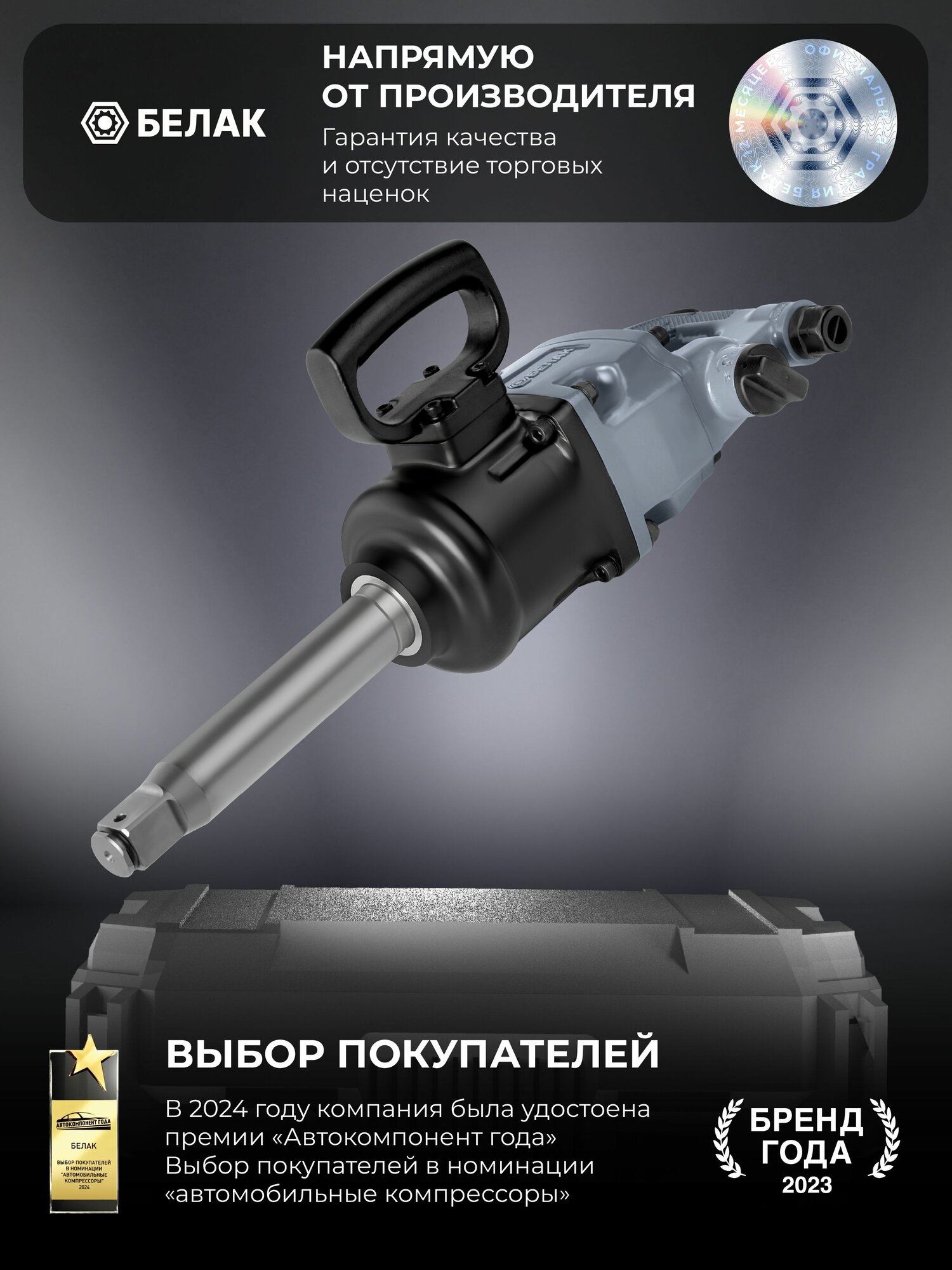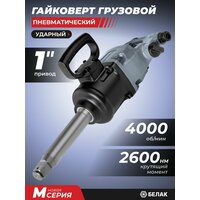 Пневмогайковерт ударный грузовой 1” БелАК – надежный пневматический инструмент для быстрого откручивания и закручивания болтов, гаек и других резьбовых соединений. Благодаря продуманному механизму и качественным компонентам, устройство подойдет для использования как в бытовых, так и в профессиональный целях. Мощный пневмогайковерт воздушный идеально подойдет для автосервиса, шиномонтажа (в том числе для грузовиков) и других работ, где нужны усилия пневмоинструмента. Модели отличаются повышенной надежностью, долговечностью и удобством в использовании. Производственная лаборатория «БелАК» усовершенствовала механизм грузового гайковерта с ориентацией на повышенный ударный момент на старте. Это позволяет срывать и откручивать любые прикипевшие и заржавевшие болты и гайки, не повреждая при этом сам крепеж. Корпус инструмента изготовлен из износостойкого металла, что обеспечивает дополнительную защиту от механических повреждений и гарантирует долгий срок службы. Удобная эргономичная рукоятка снижает уровень вибрации и делает работу комфортной даже при продолжительном использовании. Пневмогайковерт ударный для компрессора удобно лежит в руке, не выскальзывает и обеспечивает точный контроль над процессом закручивания. Компактные размеры позволяют работать в труднодоступных местах, где требуется высокая точность и мощность одновременно. Присоединительный штуцер 1/2" позволяет быстро менять ударный гайковерт с другим пневмоинструментом без отключения давления в сети. Главное преимущество пневматического гайковерта БелАК — высокий крутящий момент, который достигает значений, позволяющих без труда справляться с прикипевшими соединениями и крупными крепежными элементами. Инструмент стабильно работает при давлении воздуха около 6,2 бар, что делает его универсальным решением для большинства компрессоров. Кроме того, пневмоинструмент БелАК отличается экономичным расходом воздуха, что снижает нагрузку на оборудование и повышает общую эффективность работы. Для использования пневмогайковерта и другого пневмоинструмента рекомендуется использование воздушных компрессоров «БелАК».