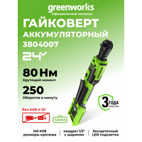 Гайковерт-трещотка акк. Greenworks GD24RW, 24V, б/щет,0-250об/мин, 1/2", 80Нм, 70 мм, без АКБ и ЗУ, сумка (3804007)