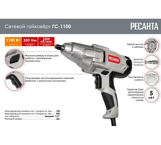 Гайковерт ударный Ресанта ГС-1100, сетевой, 1100 Вт, квадрат 1/2″, 350 Нм, реверс, в кейсе: сравнение цен, характеристики, фото, актуальное наличие и цены.