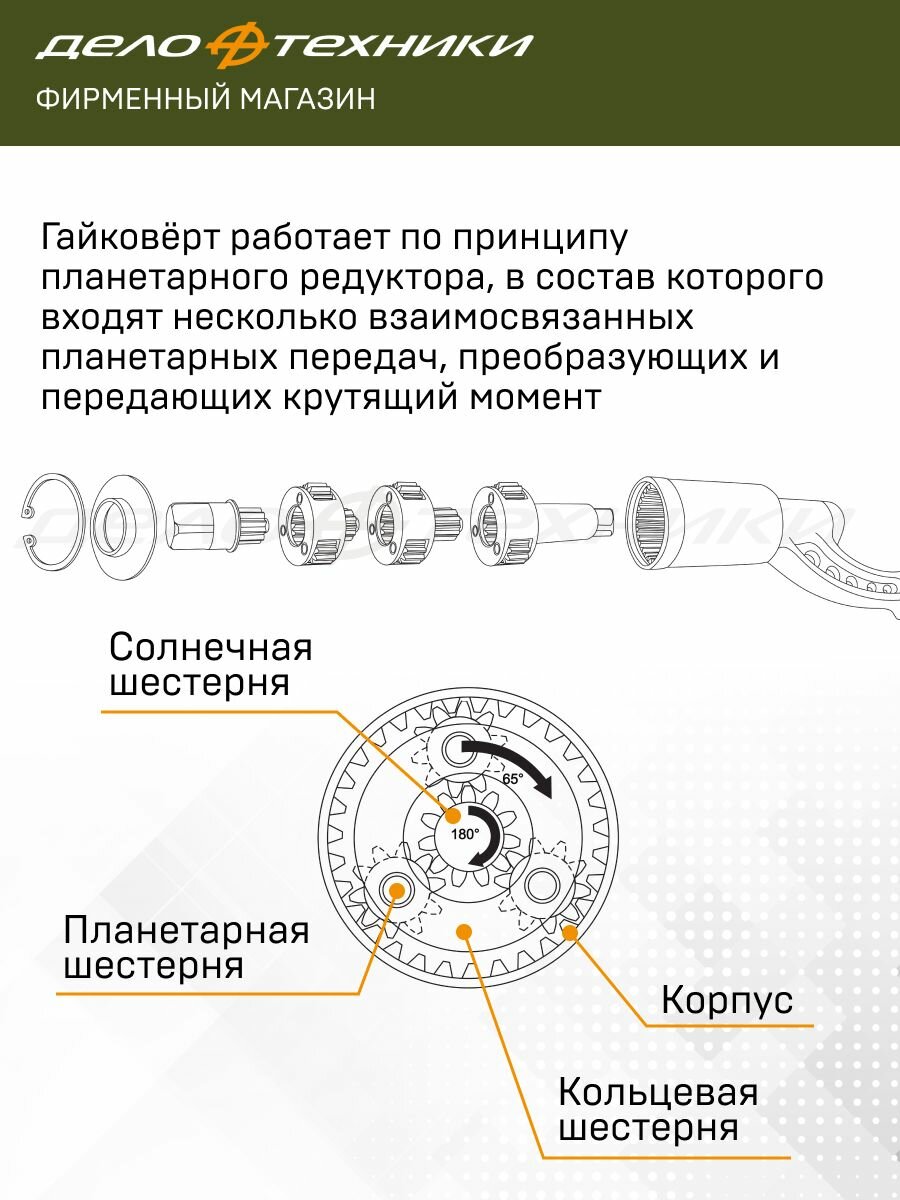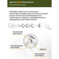 Гайковёрт работает по принципу планетарного редуктора, в состав которого входят несколько взаимосвязанных планетарных передач, преобразующих и передающих крутящий момент. Кольцевая шестерня каждой передачи является солнечной шестерней последующей передачи, тем самым достигается многократное увеличение крутящего момента. Передаточное отношения зависит от количества планетарных передач и количества зубьев каждого отдельного компонента.