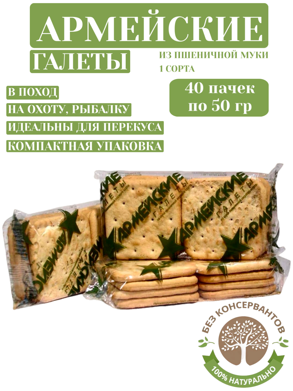 Галеты «Армейские» по 50г в упаковке - это легкий, питательный перекус как в условиях полевой кухни, так и в условиях быстрого ритма мегаполисов! Изготовлены в соответствии с требованиями госта. Станут прекрасным дополнением к консервам либо же собственноручно приготовленной домашней еде. Срок годности 24 месяца. В комплект входит 40 упаковок по 50г.