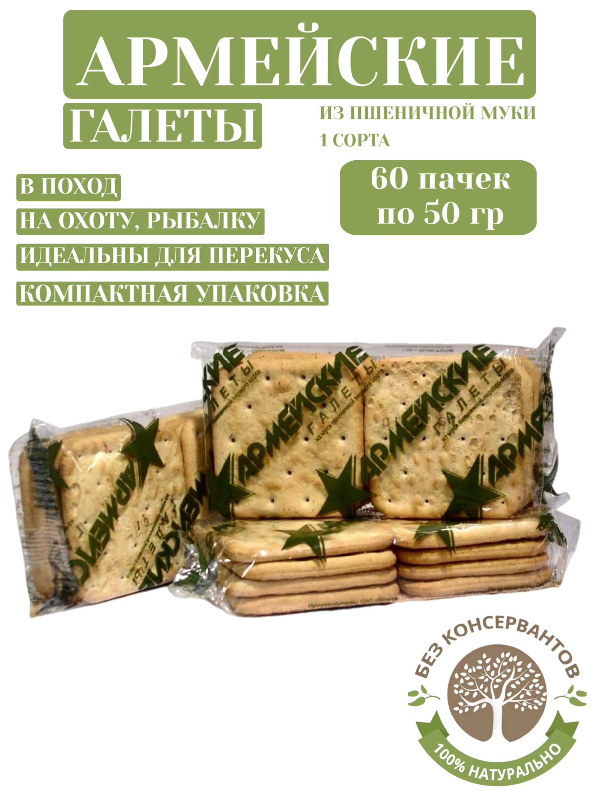 Галеты «Армейские» по 50г в упаковке - это легкий, питательный перекус как в условиях полевой кухни, так и в условиях быстрого ритма мегаполисов! Изготовлены в соответствии с требованиями госта. Станут прекрасным дополнением к консервам либо же собственноручно приготовленной домашней еде. Срок годности 24 месяца.