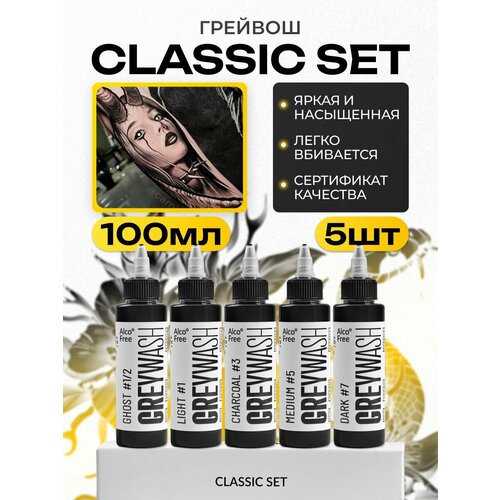 Classic Set Greywash - идеально подходит для портретного реализма и остальных стилей в технике постепенного набора тона. Все градации цвета имеют классические индексы темноты, к которым привыкли тату-мастера.