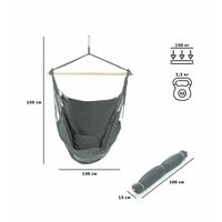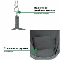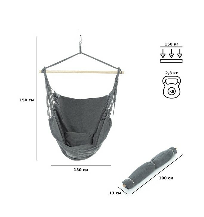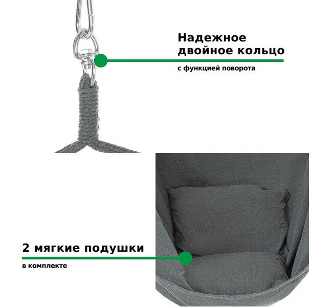 Гамак оснащен надежным крючком для крепления и двумя мягкими подушками, что обеспечивает дополнительный комфорт при отдыхе. Боковой карман позволяет удобно хранить книги или другие мелочи, сохраняя их в пределах руки.