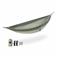 Оснащен встроенным карманом, который также является крышкой для упаковки. Гамак следует подвешивать на пролете около 3 м. Достаточно двух деревьев или других прочных точек крепления. Прикрепите к ним гамак с помощью веревок и карабинов, входящих в комплект.