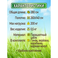 Размер полотна: 260х140 см Общая длина: 280 см Вес изделия: 0,5 кг Макс. нагрузка: 200 кг Тип: Двухместный Габариты в упаковке: 18x13x10 см Материал: Парашютный шёлк, карабины - сталь Комплектность: Гамак, карман-чехол, 2 верёвки по 2 м + удобное крепление