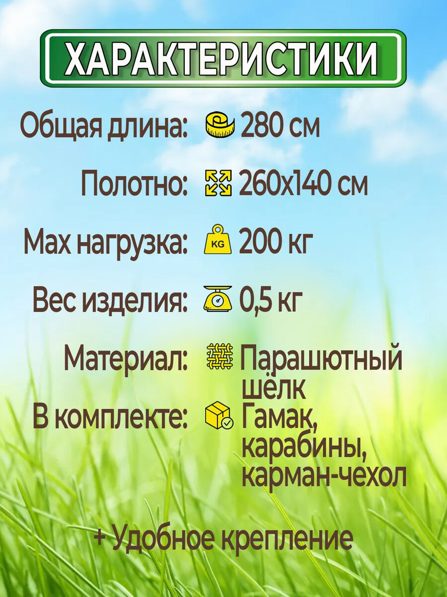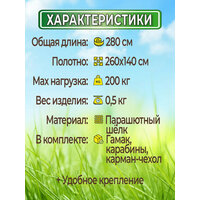 Размер полотна: 260х140 см Общая длина: 280 см Вес изделия: 500 г Макс. нагрузка: 200 кг Тип: Двухместный Габариты в упаковке: 18x13x10 см Материал: Парашютный шёлк (полиэстр 70D), карабины - сталь Комплектность: Гамак, карман-чехол + удобное крепление