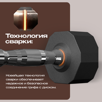 Новейшая технология сварки обеспечивает надежное соединение грифа с диском, а уникальная двенадцатигранная форма гантелей предотвращает их скатывание во время тренировок. Плоские края упрощают хранение гантелей, что делает их удобным и компактным инвентарем для вашего зала.