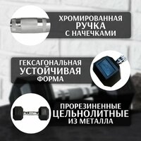 Гексагональные резиновые гантели Red Skill подходят для занятий бодибилдингом, занятий функциональным тренингом, занятий фитнесом и лечебной физкультурой. Форма гантелей универсальна и позволяет выполнять самые различные физические упражнения. Например, она подходит для выполнения реабилитационной программы после травм, укрепления мышечного каркаса, а также используется в качестве опоры в таких упражнениях, как: планка, отжимания от пола и стойка на руках. Гантель имеет неразборную конструкцию с грузом шестигранной формы. Благодаря этому снаряд устойчив на полу и надежно фиксируется на любой поверхности. Благодаря стальному грифу с рельефными насечками обеспечивается надежный хват и безопасные условия для занятий. Вы можете не беспокоиться за механическое воздействие снаряда на половое покрытие, т. к. обрезиненный груз не оставляет следов эксплуатации. Диаметр ручки изменяется в зависимости от веса! От более тонкой к более толстой: 2,5кг – 2,8 см, 45кг – 4 см. Покрытие грифа: хромированный, покрытие диска: обрезиненный. Форма дисков шестиугольная.