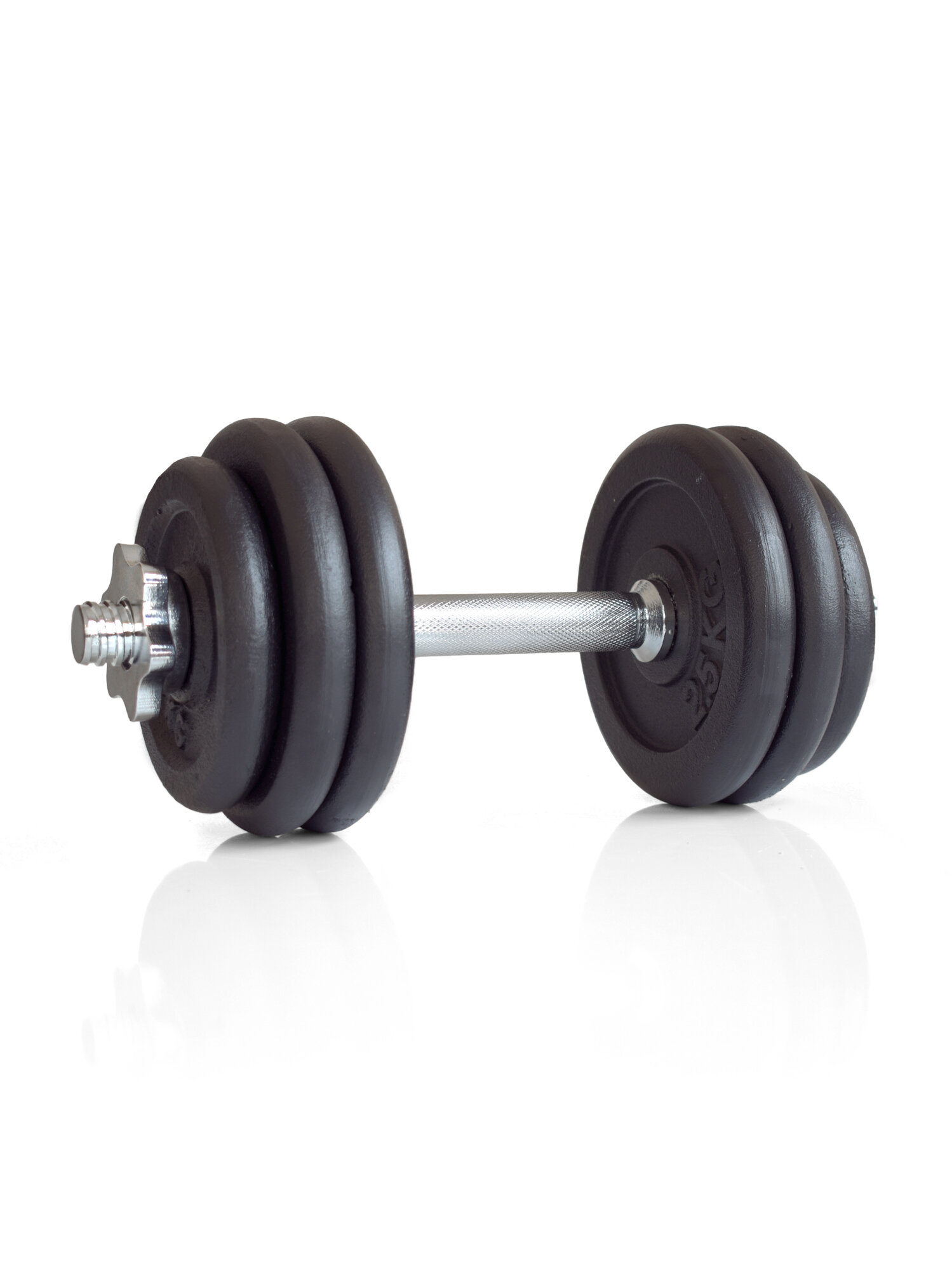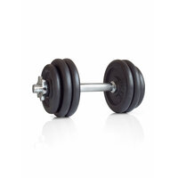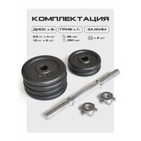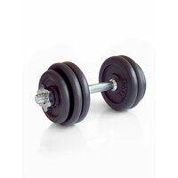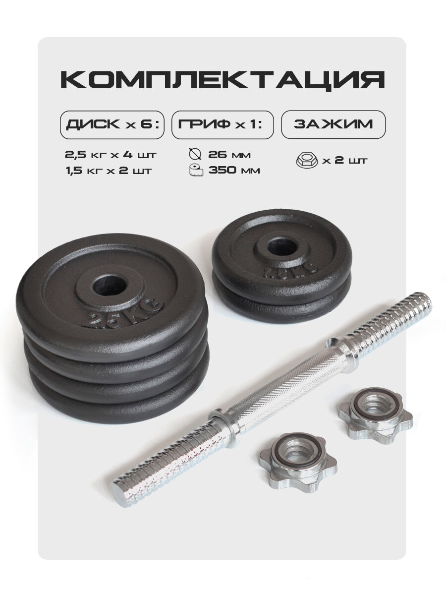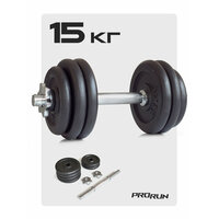 Разборная гантель ProRun весом 15 кг универсальный спортивный инвентарь для занятий фитнесом и тяжелой атлетикой. Гантель наборная отлично подходит для домашних тренировок. Благодаря сборной конструкции можно подобрать для себя оптимальный вес в зависимости от подготовки и вида упражнений. В комплект гантели входят чугунные диски весом 1,5 кг (2 штуки) и 2,5 кг (4 штуки), а также стальной гриф с посадочным диаметром 26 мм и длиной 35 см. Хромированный гантельный гриф идет с двумя металлическими замками-гайками, которые надежно фиксируют блины. Рукоятка грифа имеет специальную насечку, которая увеличивает сцепление с ладонью и повышает безопасность во время тренировок. В комплект наборной гантели входит 4 черных чугунных диска. Сборная чугунная гантель занимает меньше места чем пластиковая и обеспечивает большую амплитуду при некоторых упражнениях, что делает тренировки с металлическими гантелями более эффективными.