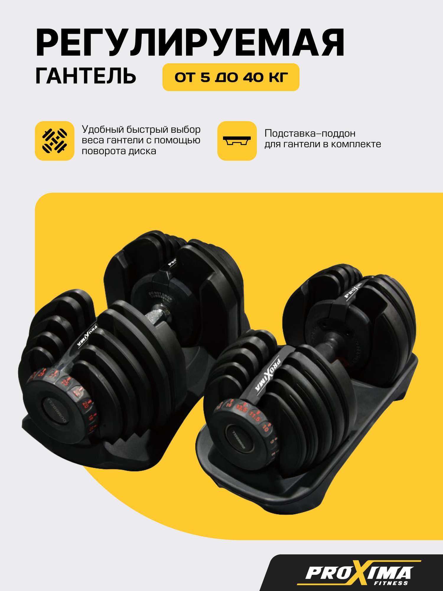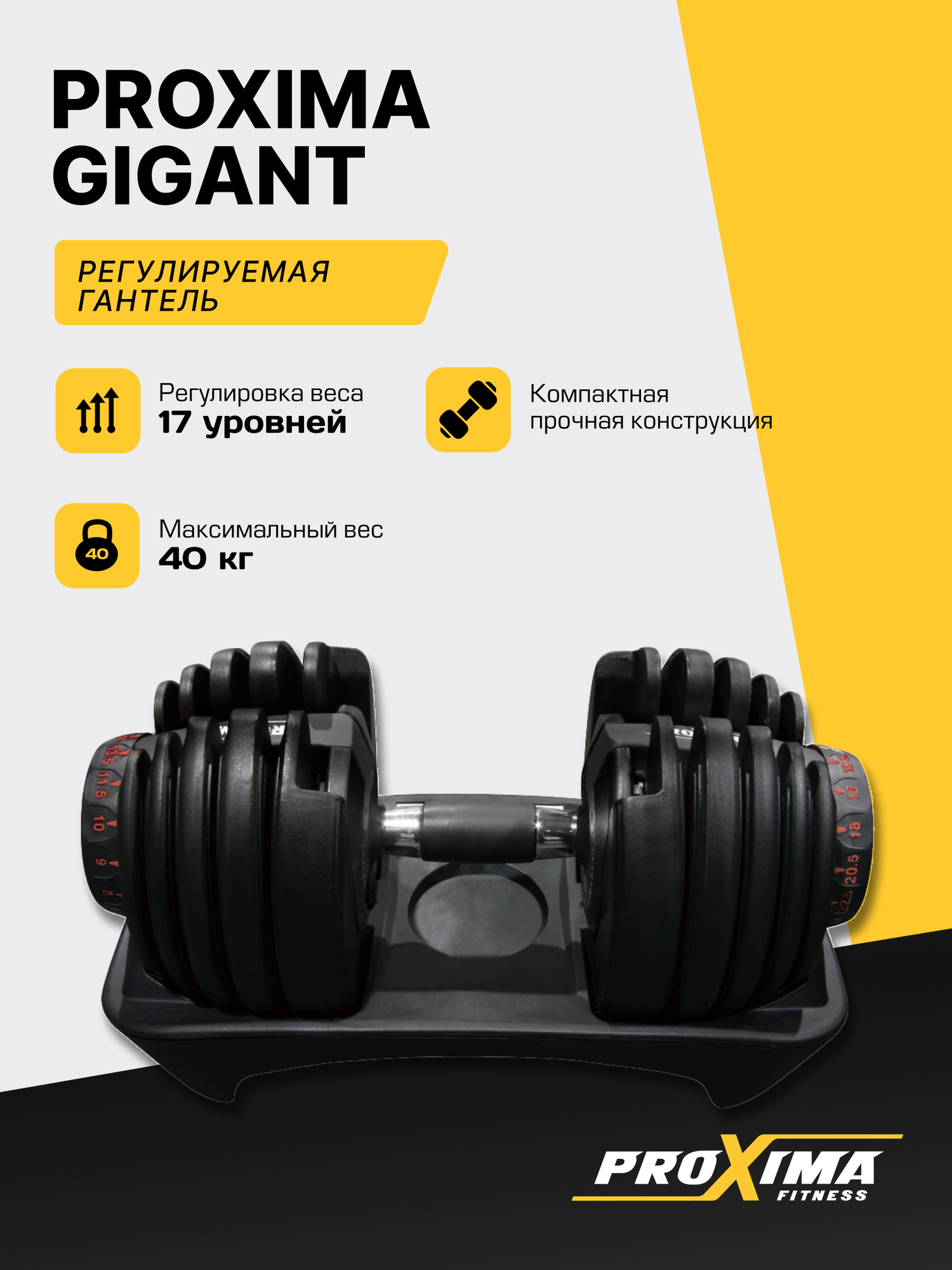 Регулируемая гантель c возможностью изменения веса от 5 до 40 кг идеальна для домашних тренировок, поскольку экономит место, время и деньги. Удобный и быстрый выбор веса гантели осуществояется с помощью поворота диска. Имеет 17 уровней регулировки.