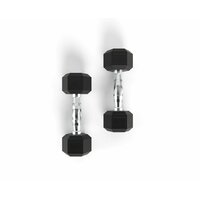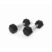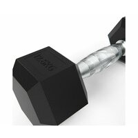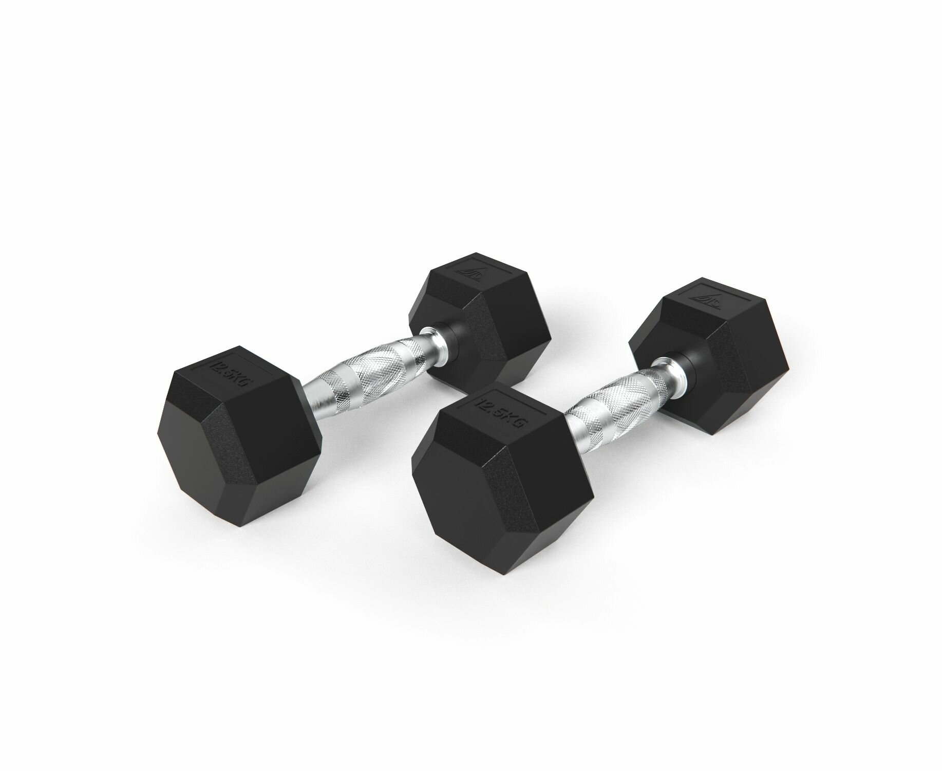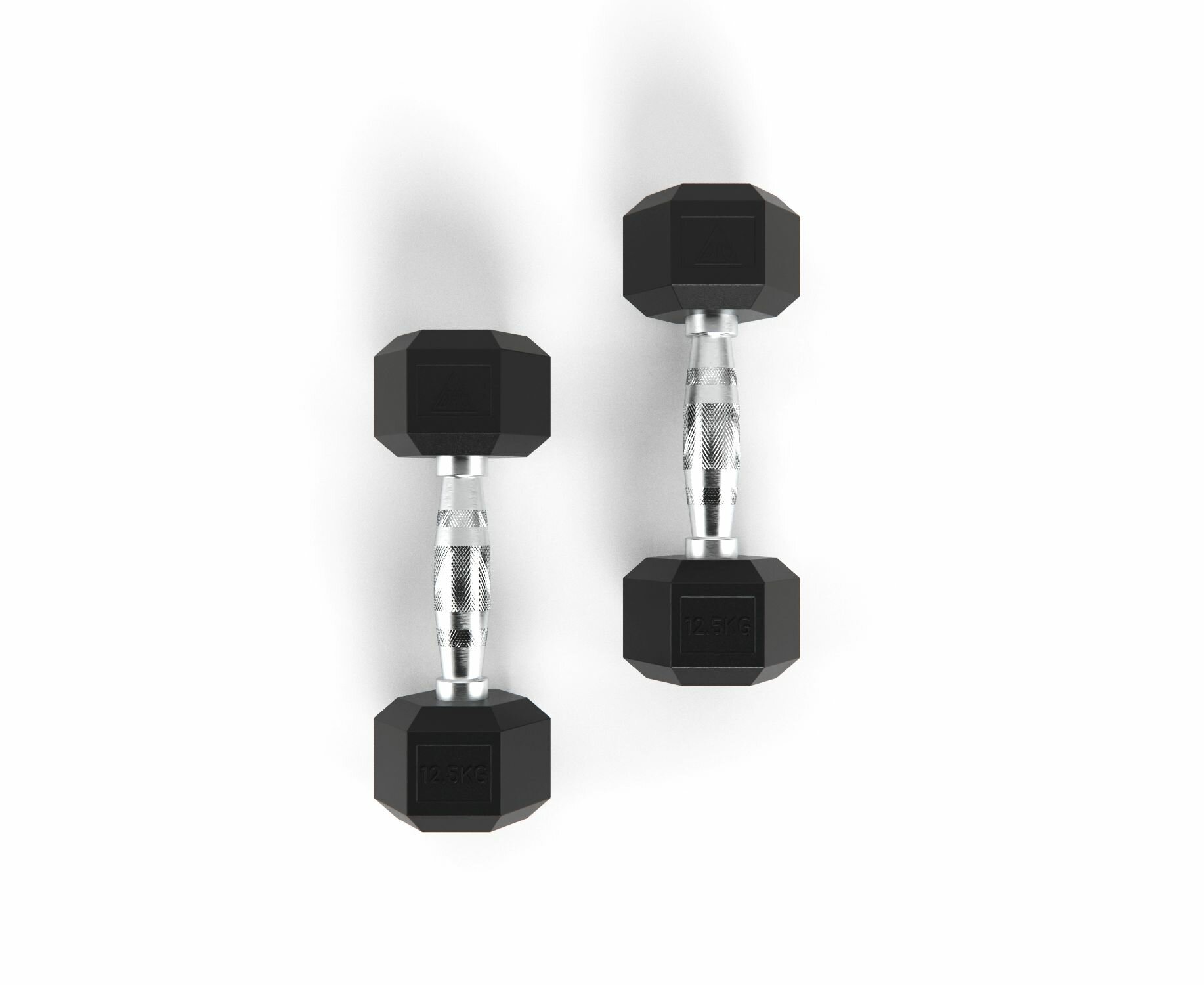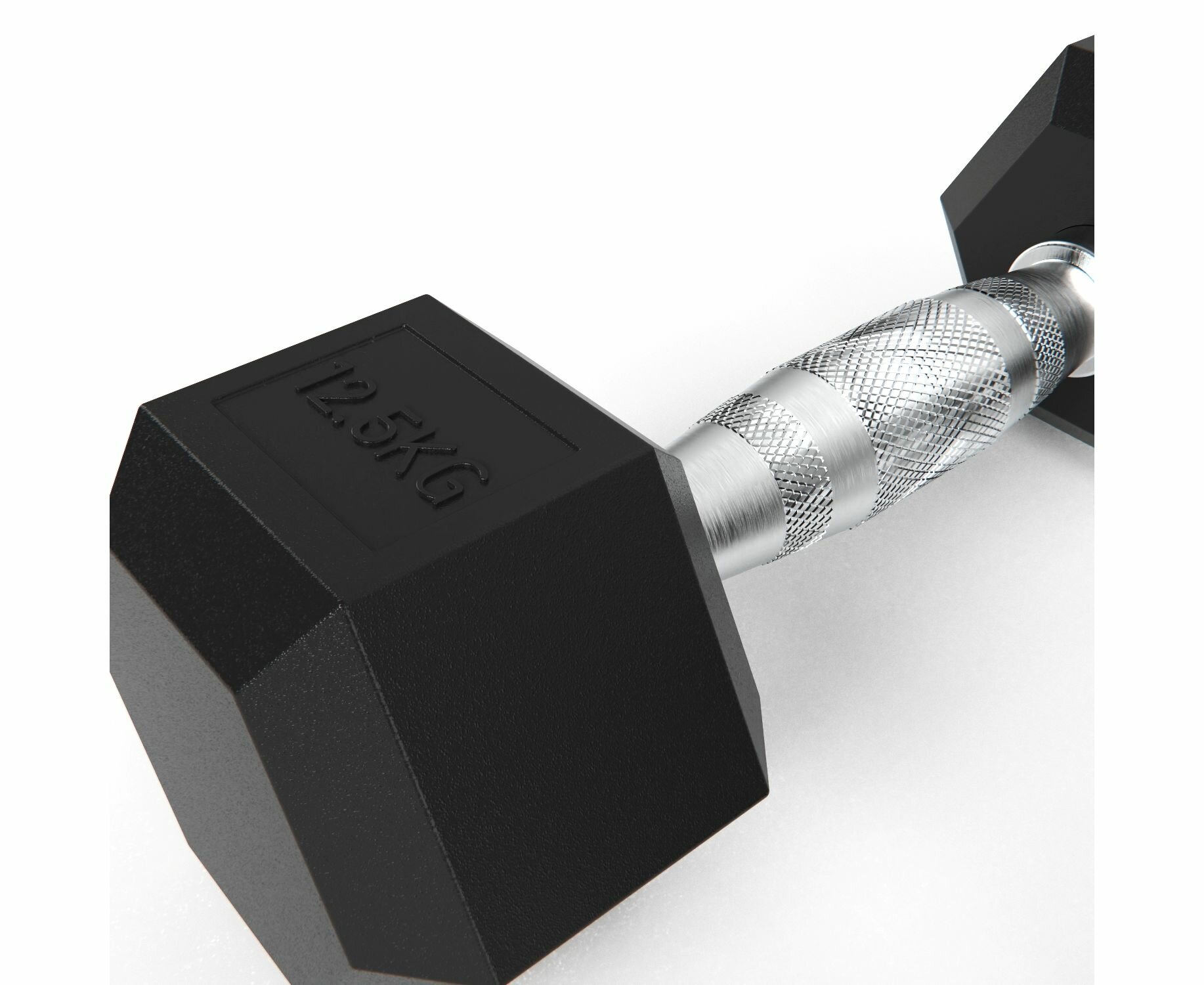 Гантель обрезиненная с хромированной ручкой. Вес гантели 12.5 кг, в комплекте 2 штуки (пара). Ручка с насечками для предотвращения скольжения. Гексагональная гантель – обрезиненная модель удобной конструкции. Гантель имеет много граней и не катается по полу. Обрезиненная поверхность не царапает пол при ударе.